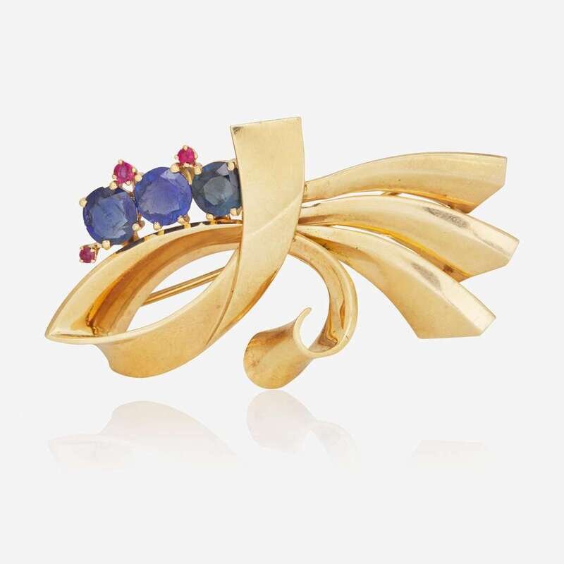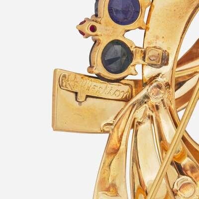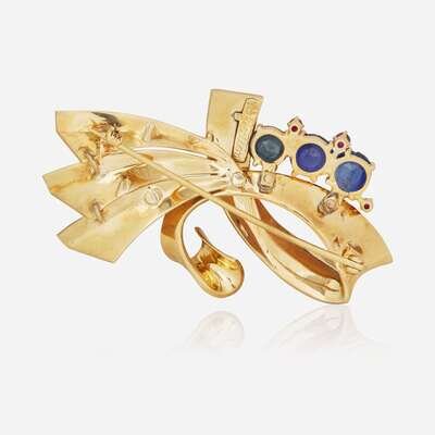 A 14K Yellow Gold, Sapphire, and Rubies Brooch Reflections By Trabert & Hoeffer Mauboussin