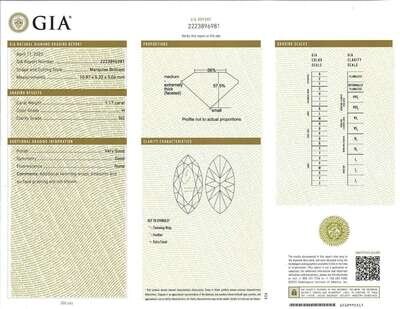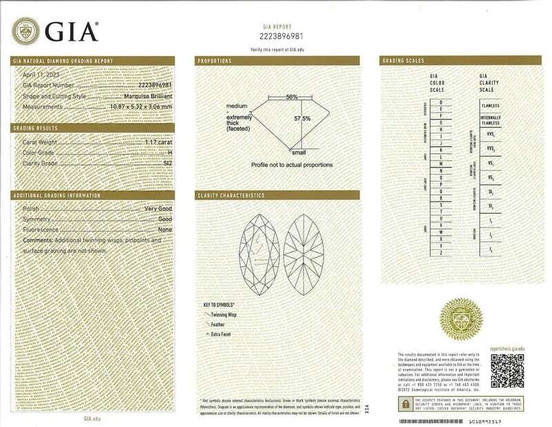 A 14K white gold ring centering a solitaire marquise brilliant-cut diamond weighing approximately 1.17 carats, near colorless (H), with SI2 clarity. Accompanied by GIA Report Number: 2223896981.