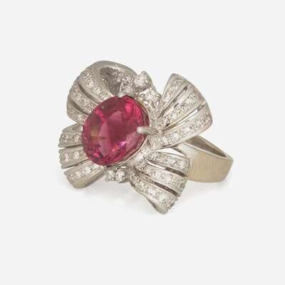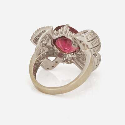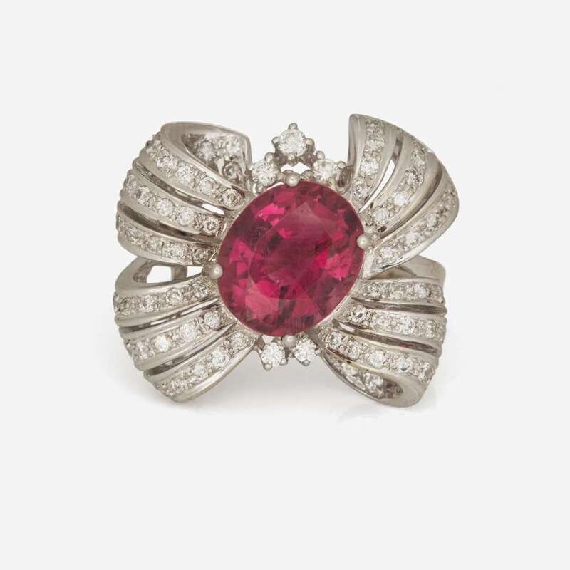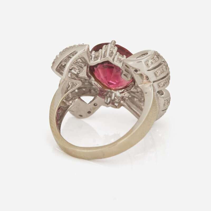 An 18K white gold ring, designed as a swooping bow, centering an off-kilter oval-cut pink tourmaline measuring approximately 9.44mm x 11.45mm, surrounded by accents of round brilliant-cut diamonds. Diamonds are near colorless (G - J), with VS - SI clarity. Total estimated weight of diamonds: 0.90 carats.