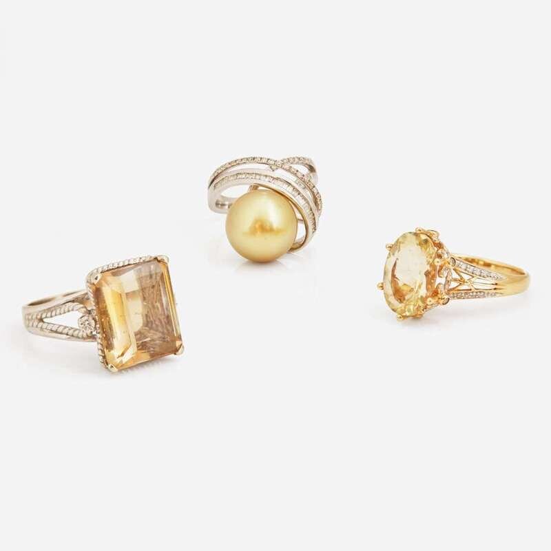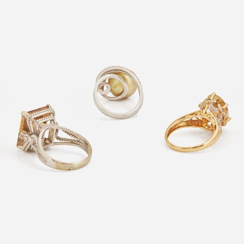 A collection of three contemporary rings, including a 14K rose gold ring set with an oval-cut yellow brown quartz stone with round brilliant-cut diamond accents, an 18K white gold ring set with a round golden pearl measuring approximately 12.92mm with round brilliant-cut and baguette-cut diamond accents, and a 14K white gold ring set with an emerald-cut smoky quartz measuring approximately 14.00mm x 15.80mm with round brilliant-cut diamond accents. Diamonds are near colorless (G - J), with SI - I clarity. Total estimated weight of diamonds: 1.00 carat.