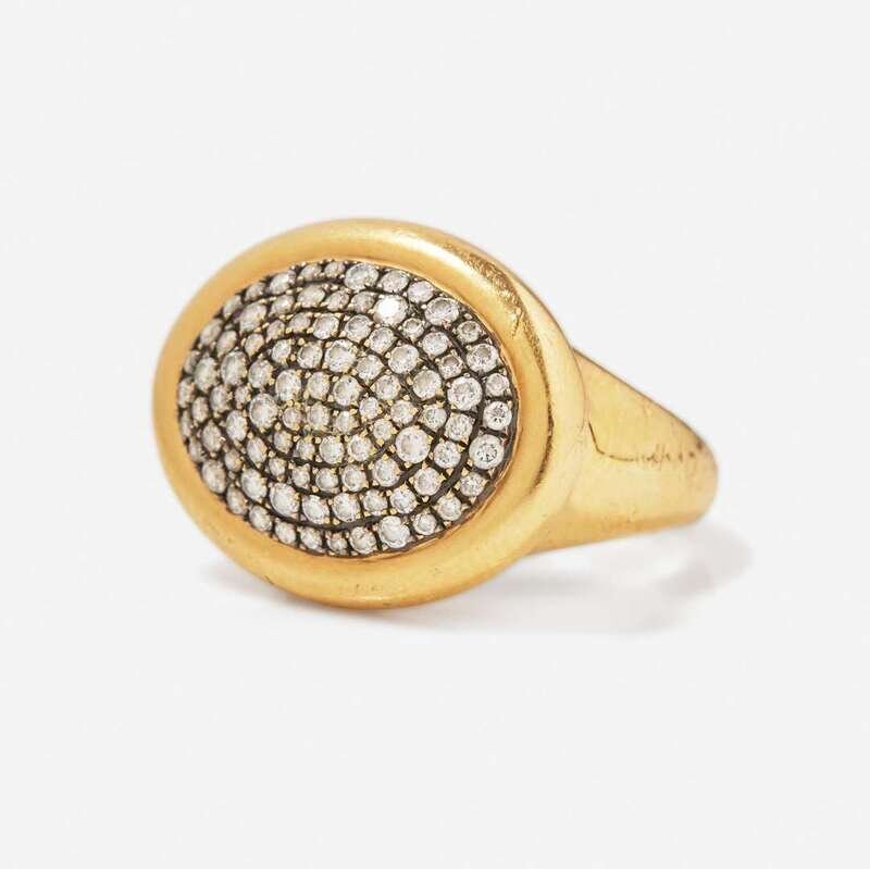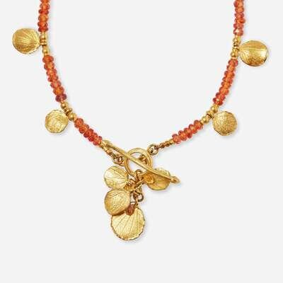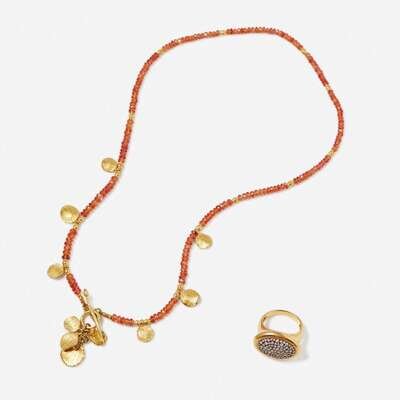An 18K yellow gold necklace Attributed to Barbara Heinrich featuring faceted topaz beads with textured yellow gold leaf accents, and an 18K yellow gold ring set with round brilliant-cut diamonds. Diamonds are near colorless (G - J), with VS - SI clarity. Total estimated weight of diamonds: 0.75 carats.