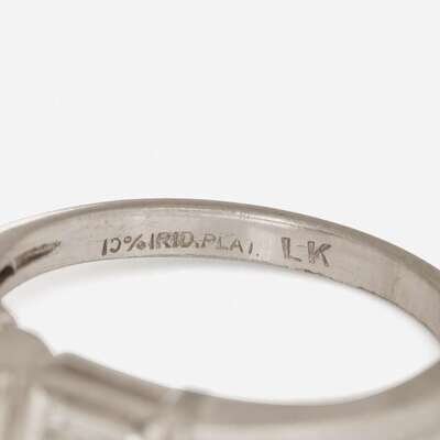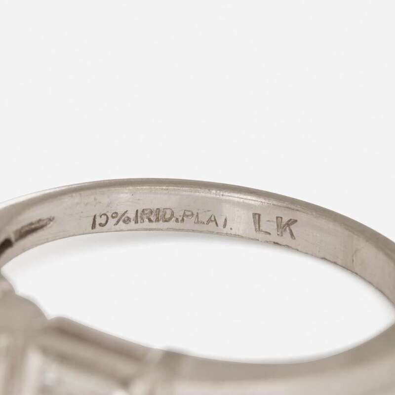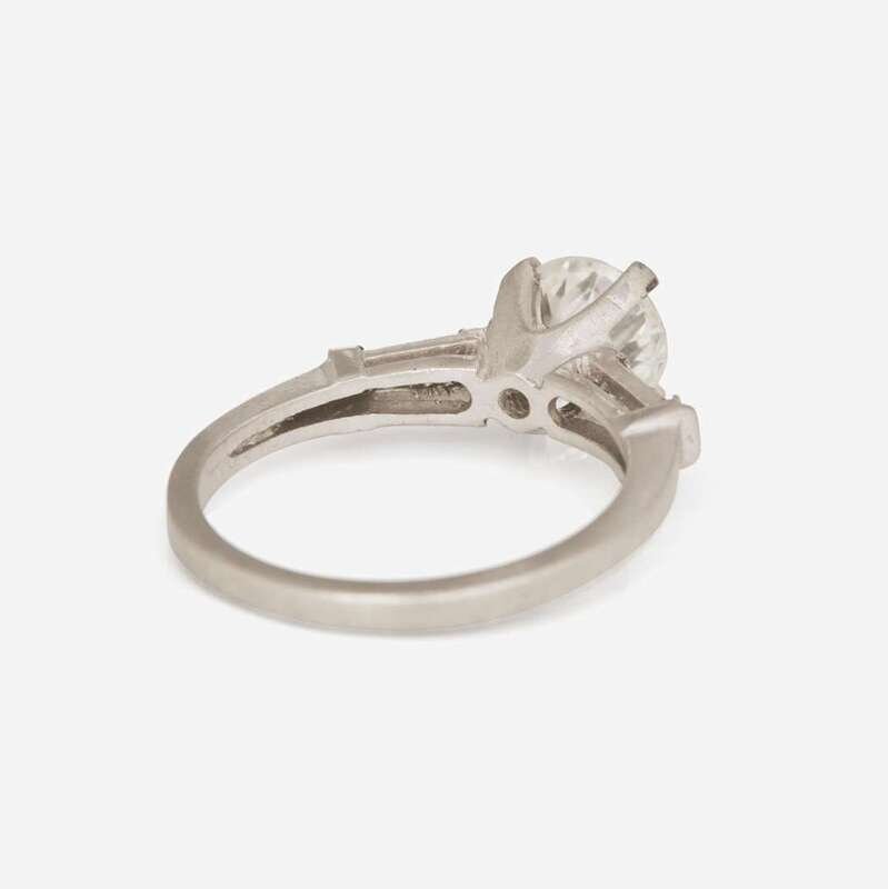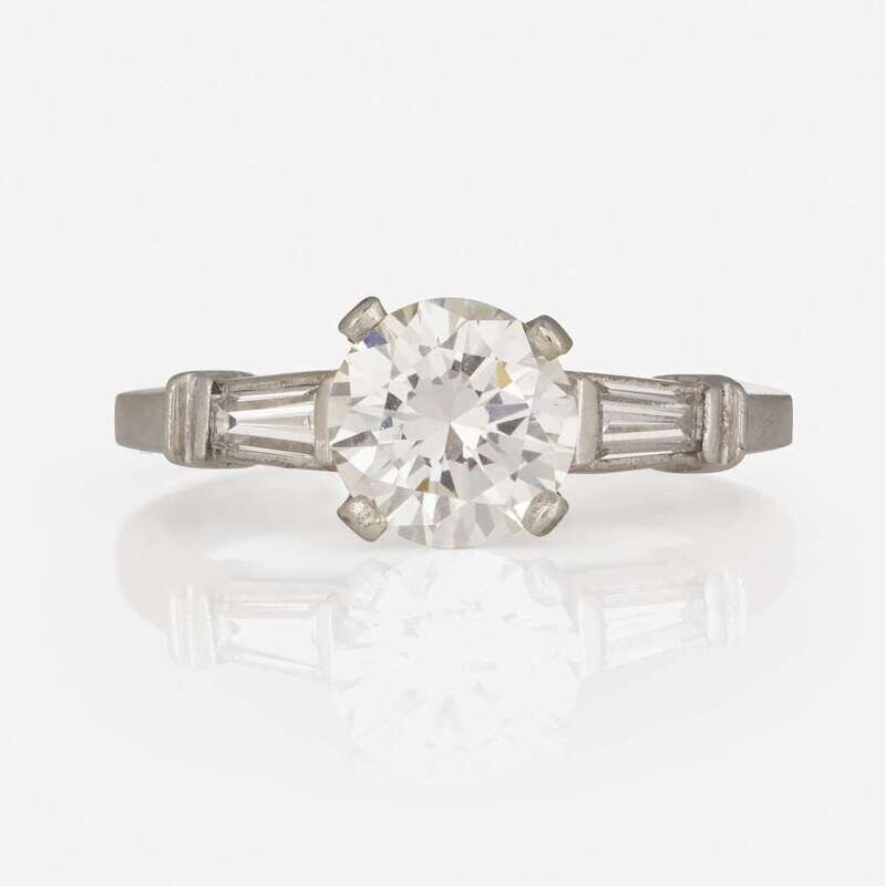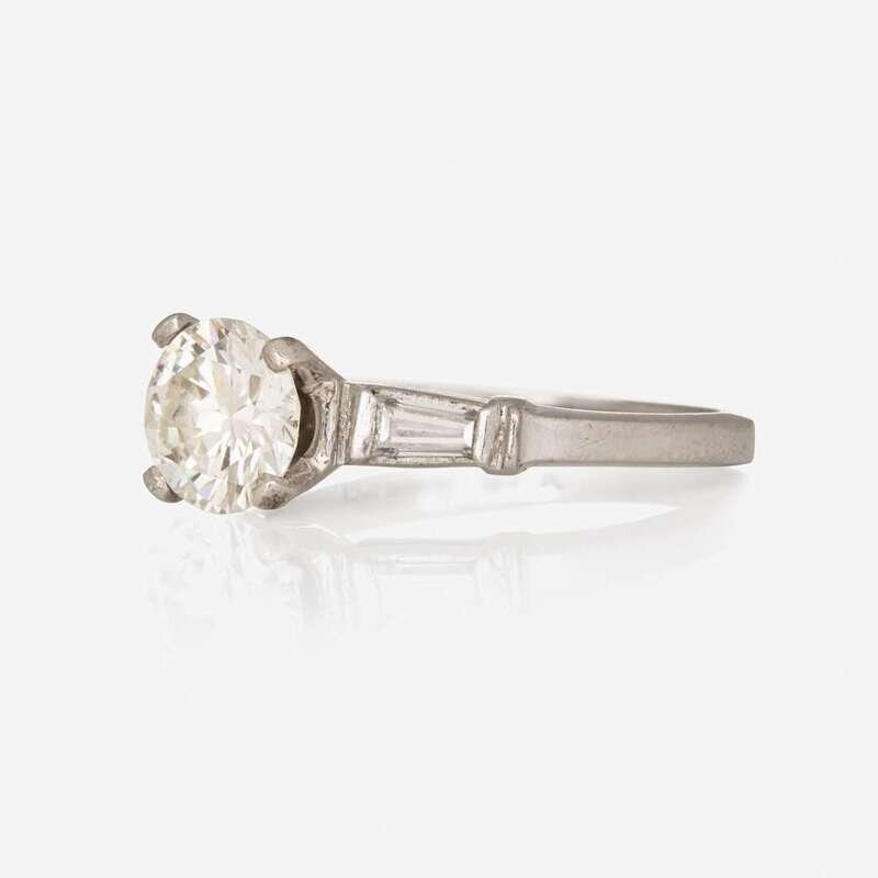 A ladies platinum ring featuring a round brilliant-cut diamond weighing approximately 1.12 carats, with (G) color, and VS1 clarity, flanked by two tapered baguette-cut diamonds, near colorless (G - J), with VS - SI clarity. Total estimated weight of diamonds: 1.31 carats. Accompanied by GIA Report Number: 2221975655.