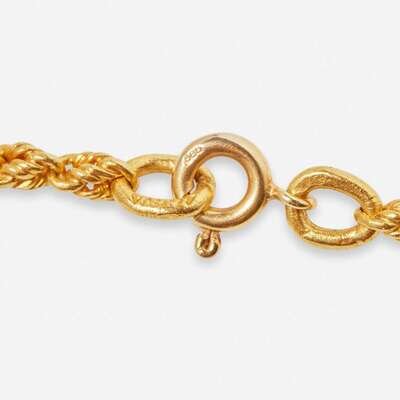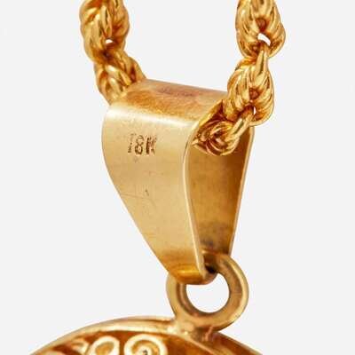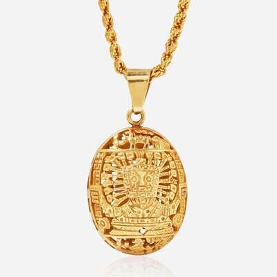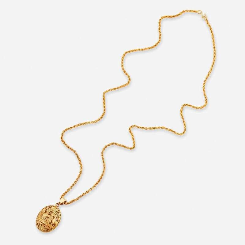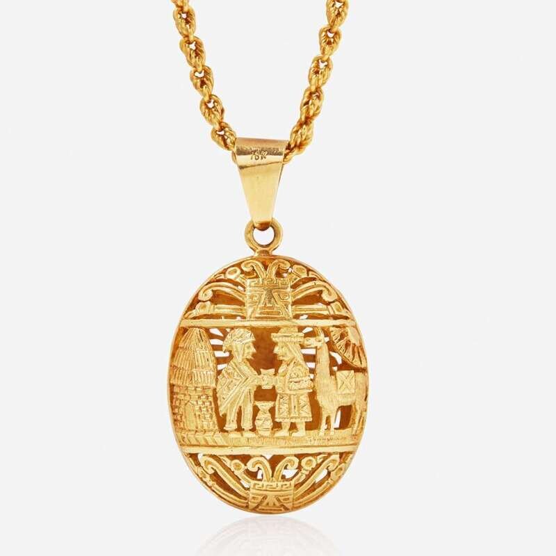 An 18K yellow gold pendant designed in an openwork hollow egg-shape, depicting scenes of traditional Peruvian life, on a 14K yellow gold twisted rope chain.
