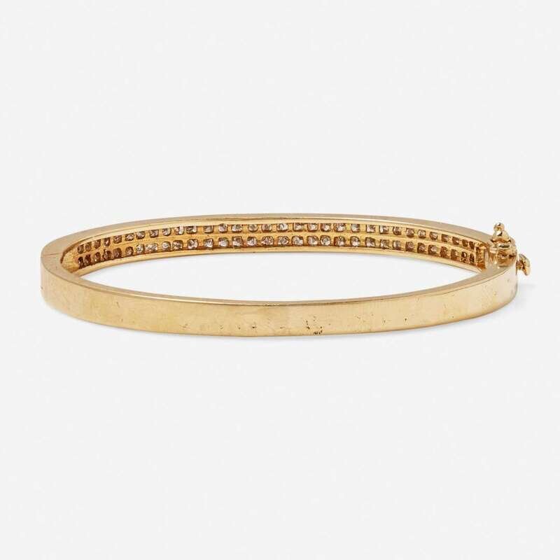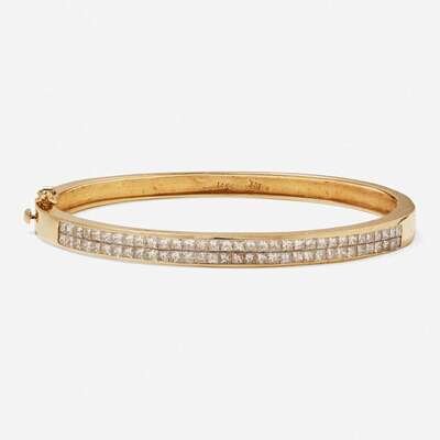 A 14K yellow gold bangle bracelet, set with sixty-six princess-cut diamonds on the top side of the bangle. Diamonds are near colorless (G - J), with VS - SI clarity. Total estimated weight of diamonds: 3.00 - 3.50 carats.