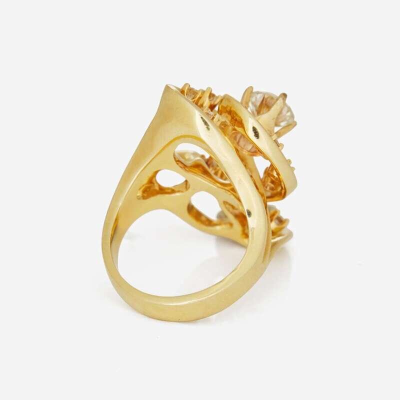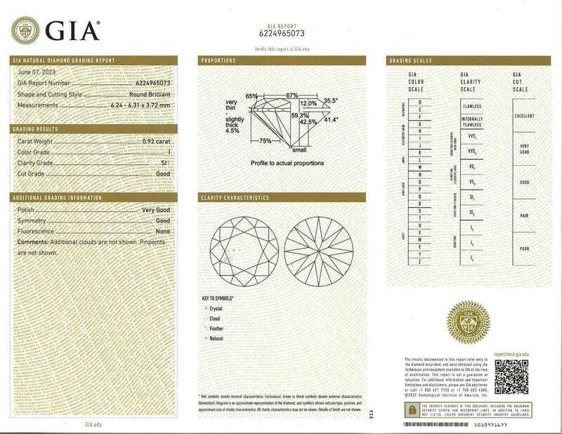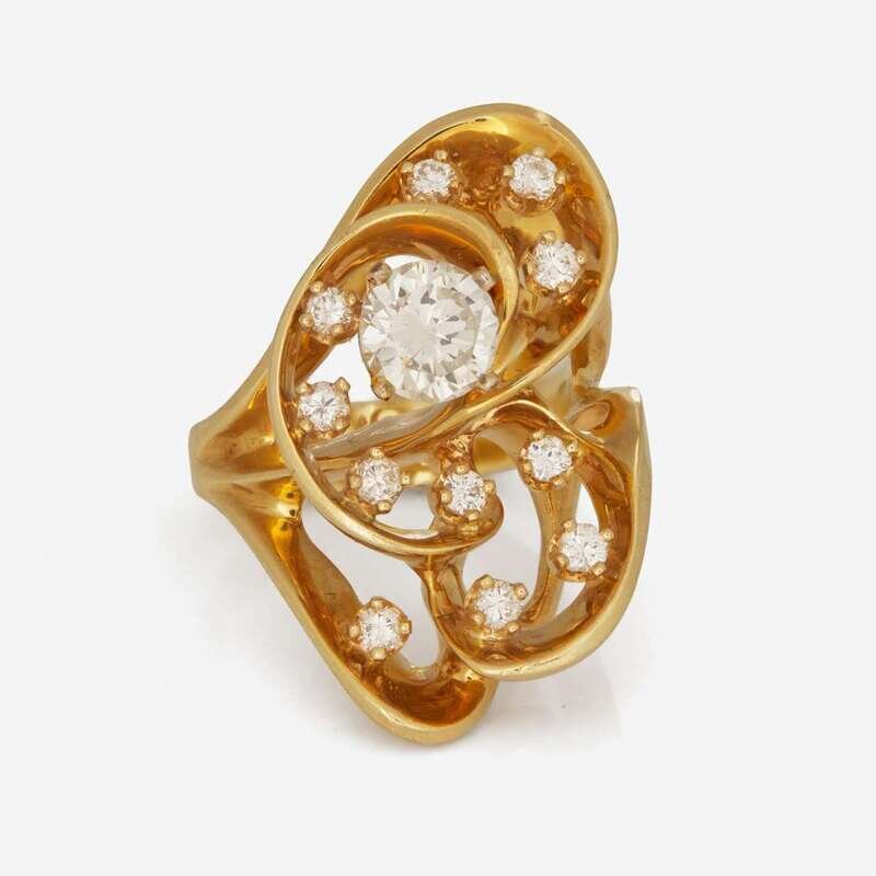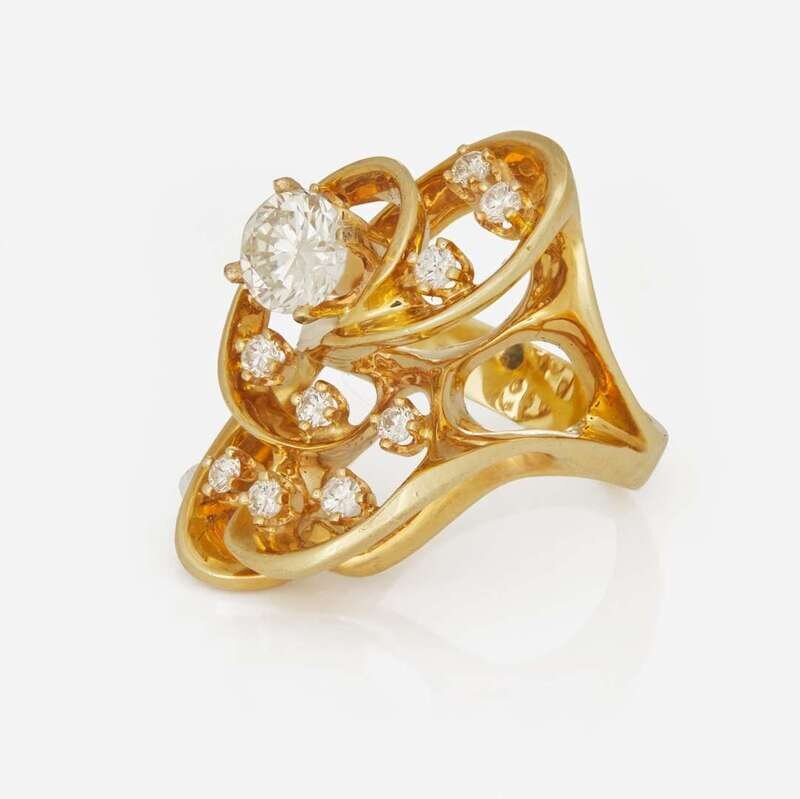 A 14K yellow gold ring featuring a 0.92 carat (I) color round brilliant-cut diamond with SI1 clarity, centered in an openwork swirling design accented by further round brilliant-cut diamonds. Accent diamonds are near colorless (G - J), with SI - I clarity. Total estimated weight of diamonds: 1.32 carats. Center diamond accompanied by GIA Report Number: 6224965073.