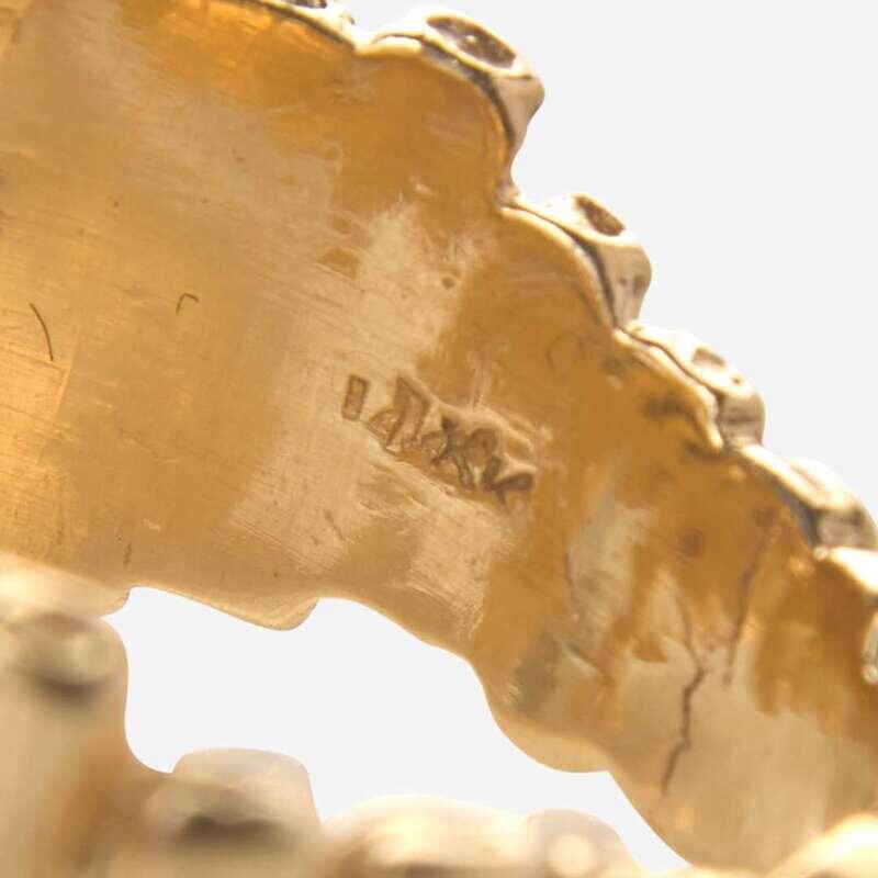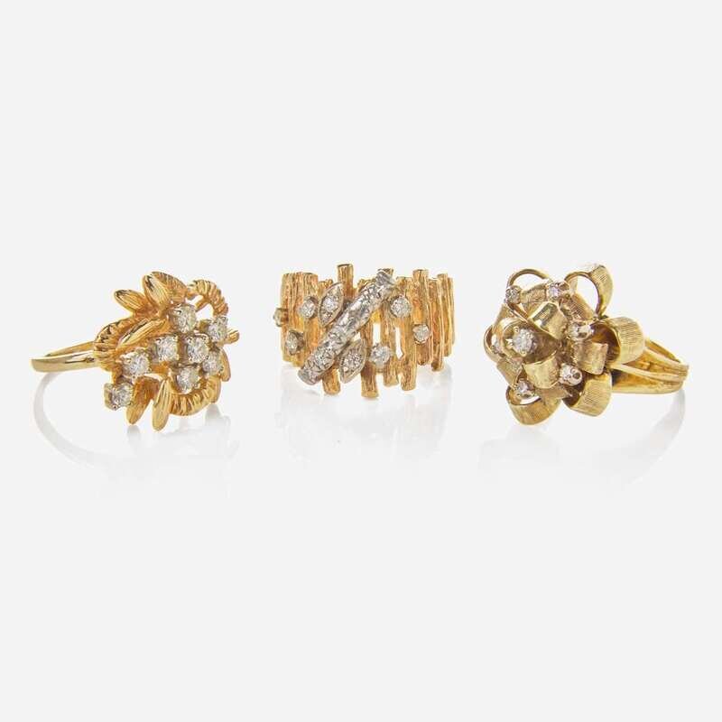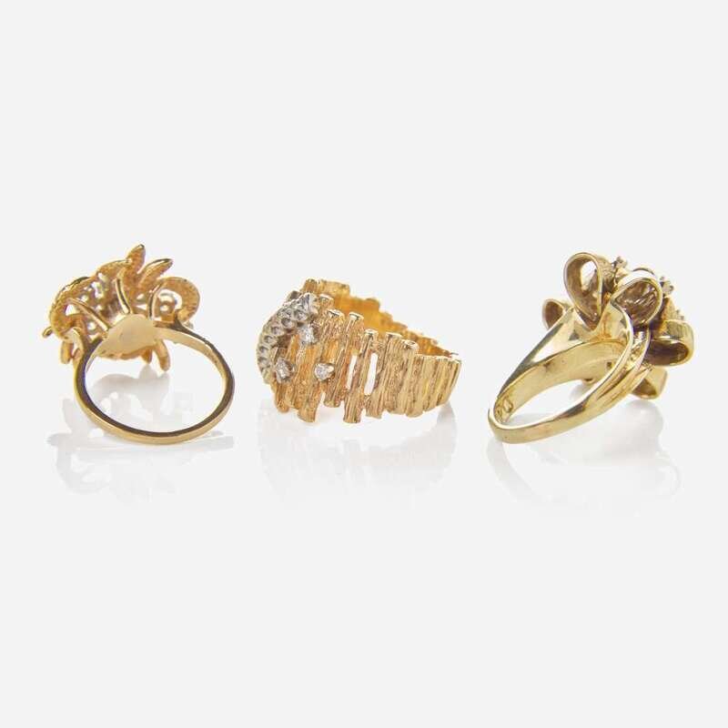 A collection of three modern yellow gold rings, including a 10K yellow gold ring designed as a textured bow accented by seven round brilliant-cut diamonds, one 14K yellow gold ring designed as bark-like textured segments with geometric white gold and diamond accents, and one 14K yellow gold ring designed as textured foliage with a spiral of round brilliant-cut diamonds. Diamonds are near colorless to faint color (G - L), with VS - I clarity. Total estimated weight of diamonds: 1.38 carats.