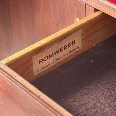 Cloth label to left drawer interior: "Romweber, Furniture of Timeless Beauty"