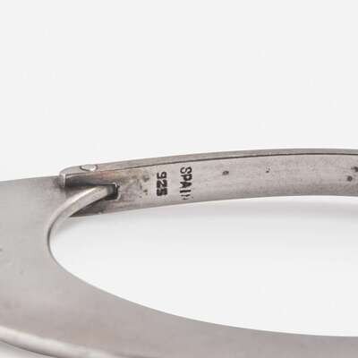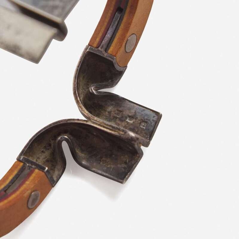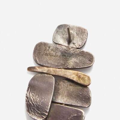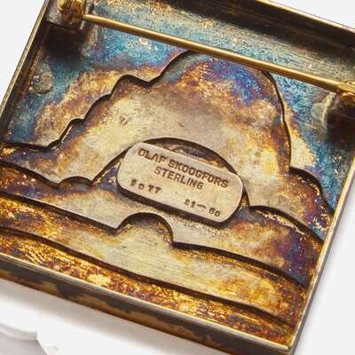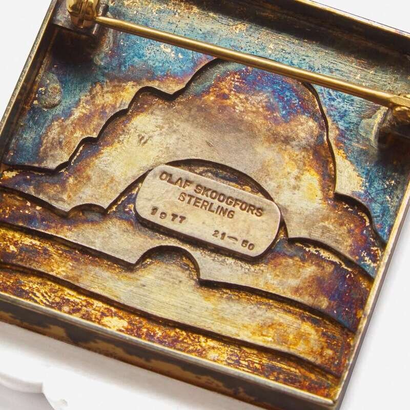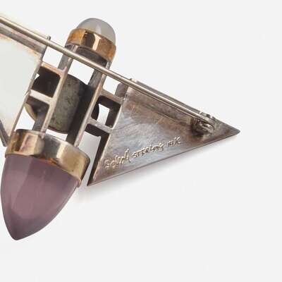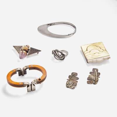 Comprised of a sterling silver Cloud brooch stamped to reverse: "OLAF SKOOGFORS STERLING 1977 21–50"; a sterling silver, 14K gold, and moonstone brooch inscribed "SOKOLL STERLING 14K"; a sterling silver bracelet impressed "SPAIN 925"; a Peter Chatwin laminated wood and sterling silver bracelet with English hallmarks; an unsigned sterling silver ring, and a pair of illegibly signed sterling silver and gold earrings