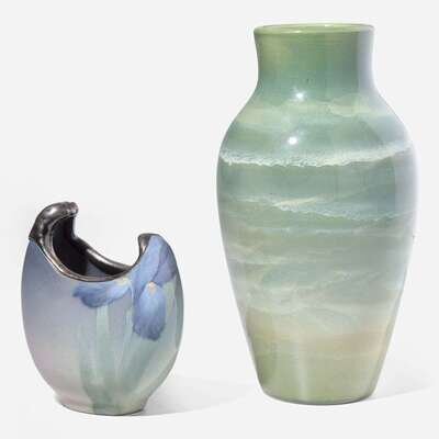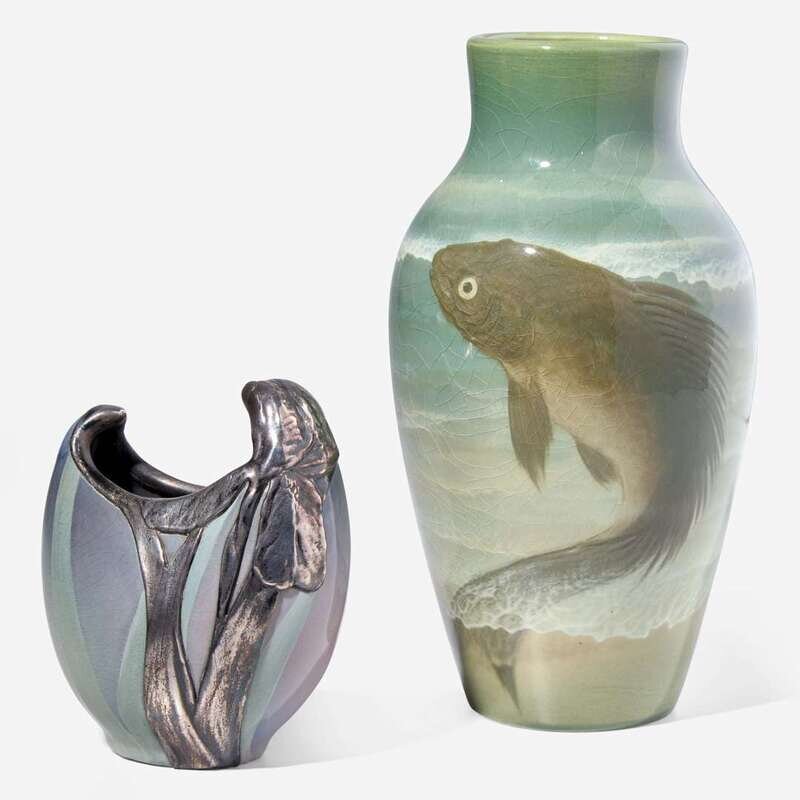 Comprised of two iris-glazed vases, the Hurley example decorated with a carp, the Diers with irises and silver overlay