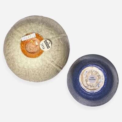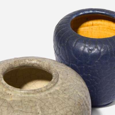 The indigo example impressed to underside: "GRUEBY POTTERY BOSTON U.S.A."; the oatmeal example with original applied paper label