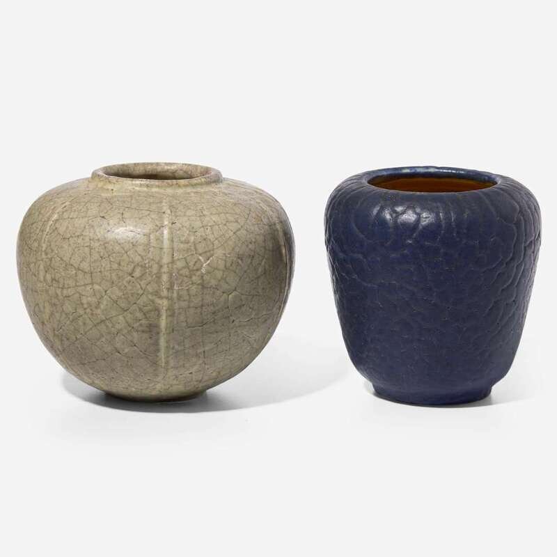 Grueby Faience Company (American, active 1894-1920) Two Curdled Glaze Vases, Boston, Massachusetts, USA, circa 1910