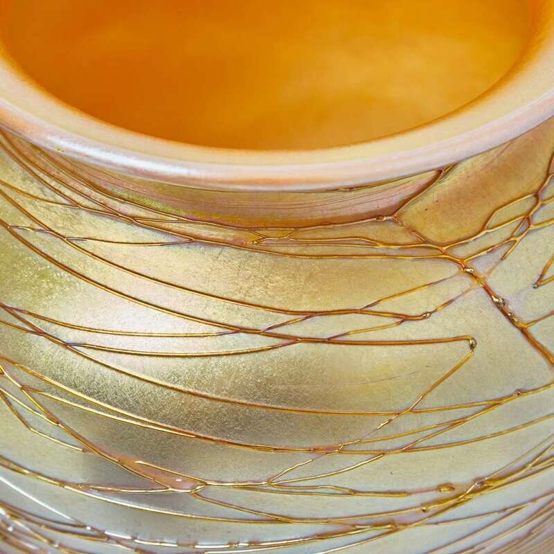 Comprised of a footed vase with Hanging Hearts decoration with iridized threading, a gold iridized vase with threading, a blue iridized vase with threading, and a spherical footed vase in the King Tut decoration