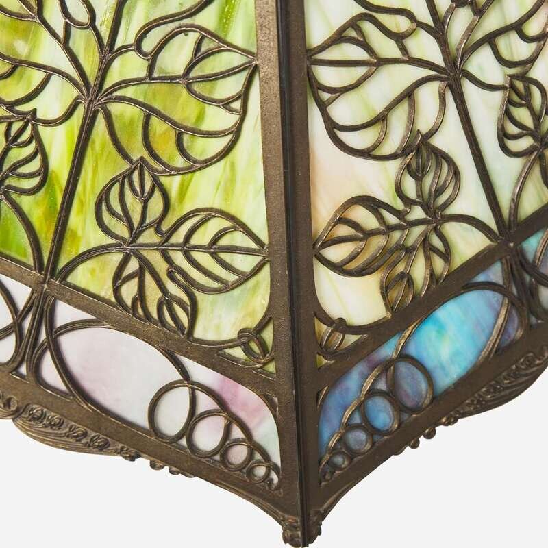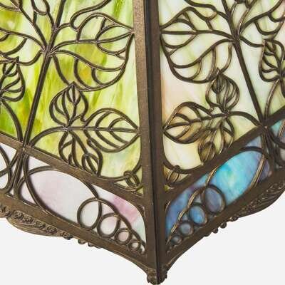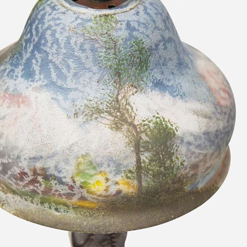 Comprised of a tall Arts and Crafts style Bradley & Hubbard lamp with slag glass paneled metal shade, and two Handel lamps with reverse-painted glass shades (both with landscape scenes)