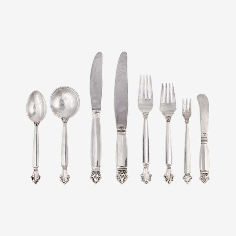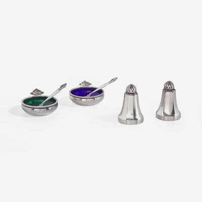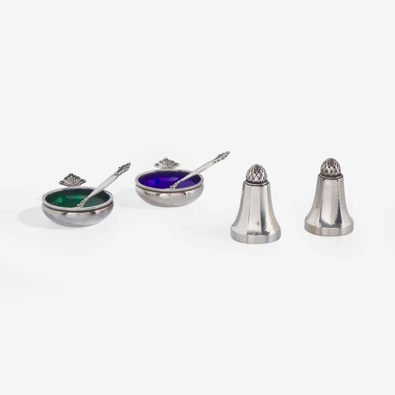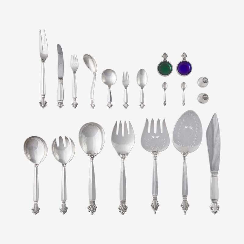 Approximately 268 pieces total; comprised of 57 large teaspoons, 48 salad forks, 24 dinner forks, 8 long handled dinner knives (with stainless blades), 24 short handled dinner knives (with stainless blades), 24 soup spoons with round bowls, 12 shrimp-cocktail forks, 4 butter knives, 3 medium serving spoons, 1 medium serving fork, 2 large serving spoons, 1 large serving fork, 1 fish serving fork, 1 fish serving knife, 1 cake knife (with stainless blade), 2 meat forks, 1 fruit knife (with stainless blade), 1 child's fork, 1 jam spoon, 1 sugar spoon, 1 baby spoon, 1 baby fork, 10 salt cellars with green enamel bowls, six salt cellars with blue enamel bowls, and 16 salt spoons; along with 17 pepper shakers in the "Acorn" pattern, model no. 423B, 15 with rubber stoppers and 2 with silver stoppers