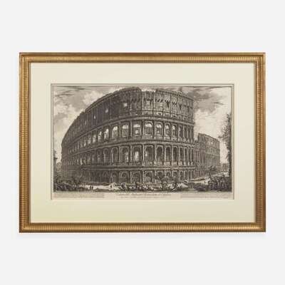 (Rome, 1757). Etching on wove paper. First state (of four). Scattered pale spotting in margins. 21 11/16 x 30 9/16 in. (551 x 776 mm). In mat and in frame, 27 1/4 x 37 1/4 in. (692 x 946 mm). Hind 57; Piranesi: Rome Recorded 59 A handsome impression with wide margins of Piranesi's dramatic view of the Colosseum, from his series, Vedute di Roma. "In this print variety characterizes the artist's means of aggrandizing the exterior for an audience interested in facts. Rather than centering the monument, which would have created a void on the right where the exterior wall no longer stands, Piranesi fills the available space. To emphasize the height of the structure, he chooses a low point of view on the Esquiline Hill. His view depicts the north-west wall, mostly intact...Piranesi directs the viewer to the monument as if he or she were an ancient Roman on the way to the games." (Piranesi: Rome Recorded, p. 89)