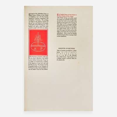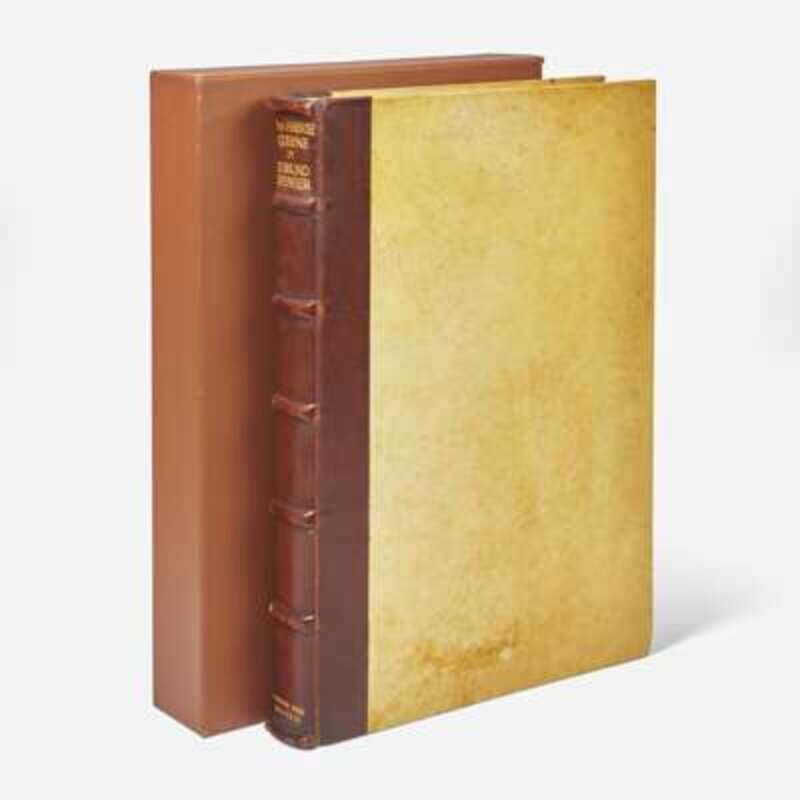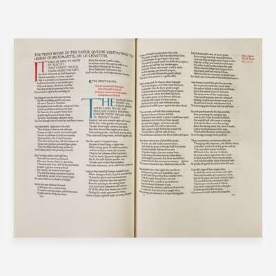 (London): The Ashendene Press, 1923. First and limited edition, one of 180 copies printed on paper. Folio. iii, (407) pp. From the library of English architect and founder of the Essex House Press, Charles Robert Ashbee, and with his book-plate on front paste-down. Text printed in red, blue, and in black. Publisher's quarter brown calf over vellum-covered boards, lettered in gilt; all edges untrimmed; hinges skillfully and indiscreetly reinforced with japanese paper; prelims lightly foxed; small stain in lower gutter of first several leaves from calf turn-in; in publisher's brown cloth slip case. Hornby 32; Ransom, p. 206; Franklin, The Private Presses p. 196; Franklin, The Ashendene Press, pp. 240-241; Tomkinson, p. 7 A fine example of one of the large folio works by The Ashendene Press. From the library of founder and major designer of the Essex House Press, Charles Robert Ashbee (1863-1942). Colin Franklin, in The Private Presses, writes, "Nobody can declare that one or another book was a printer's best, with the variety of Ashendene books issued and the changes over four decades...On the whole I think I like Faerie Queene and Morte Darthur best...Hornby liked his large books best. It is easy to see why the two tall volumes of Spenser ranked high for him..." (p. 57) An excellent copy.