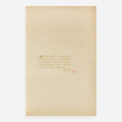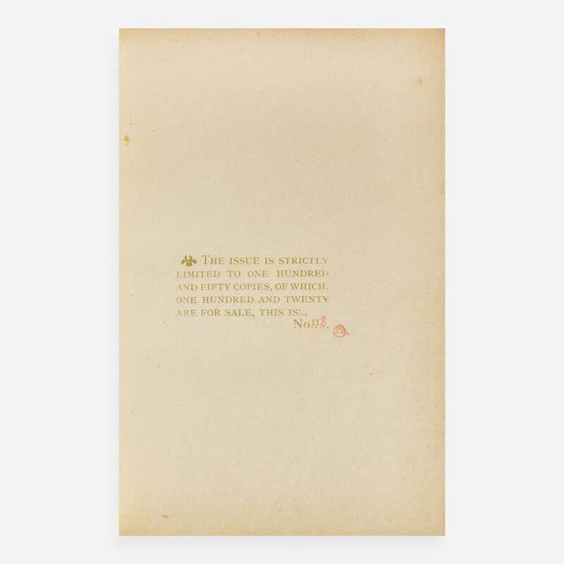 (Essex: Eragny Press, 1894). First and limited edition, #118/120 numbered copies (from a total edition of 150 copies). 8vo. (viii), 14, (2) pp. Title-page printed in gilt; text printed in red and in black. Illustrated with 12 woodcuts (including 5 printed in color, and one full-page), decorative woodcut borders printed in green and in red, and woodcut printer's device, by Lucien Pissarro. Publisher's stiff vellum, stamped with gilt floral device on front cover; top edge gilt. A lovely and scarce copy of the Eragny Press's first publication. Provenance