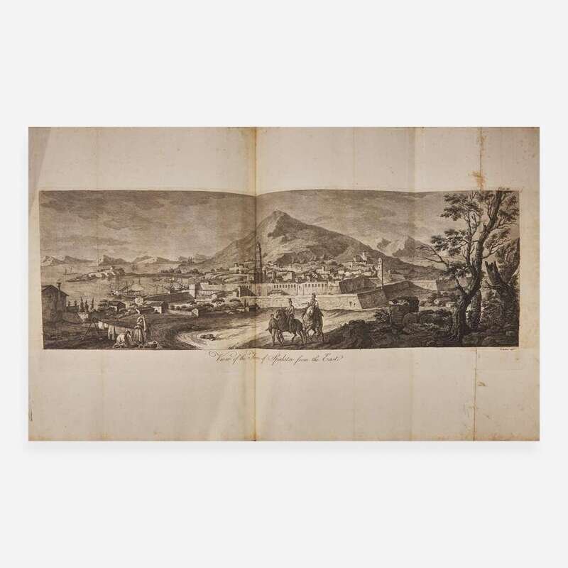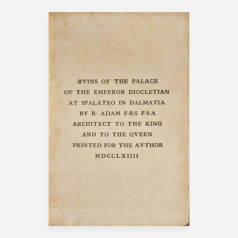 (London): Printed for the Author, 1764. First and only edition. Folio, 21 x 14 1/2 in. (533 x 368 mm). iv, (viii), 33, (1) pp. Illustrated with 61 numbered engraved plates (including frontispiece, 10 folding plates, and seven double-page plates); engraved by F. Bartolozzi, E. Rooker, F. Patton, P. Santini, A. Walker, (A.) Zucchi, P. Mazell, Dom. Cunego, and J. Bassire, after drawings by Charles-Louis Clérisseau. Full contemporary brown calf, black morocco spine labels, stamped in gilt; joints, corners, and spine ends expertly restored; boards rubbed and scratched; chipping along spine; all edges trimmed; marbled endpapers; dampstaining in bottom corner of all leaves, with tip of same repaired on frontispiece; foxing to text; moderate to heavy foxing to plates; vertical creasing in several folding plates, with foxing, dampstaining, and wear along same; top left corner creased in Plate III; dampstaining in fore-edge, Plates VII and IX; several leaves at rear toned and heavily foxed; in brown cloth fall-down-back box. Blackmer 3; Fowler, pp. 3-4; ESTC T46923; Brunet 1:46 An important work by British Neoclassical architect Robert Adam (1728-92), describing the ancient Roman palace-fortress of Emperor Diocletian, located in present-day Split, Croatia. Adam conceived of this work while on his Grand Tour (1754-58) through France and Italy studying classical architecture. In the summer of 1757, with the help of his teacher, the French architect and antiquary, Charles-Louis Clérisseau (1721-1820), and two accompanying draughtsman, Adam began to survey the largely forgotten palace ruins, built by Diocletian following his abdication in 305 AD. Adam worked closely with Clérisseau for five weeks before returning to London, while Clérisseau stayed on in Venice, from 1757-60, to oversee the engraving of some of the drawings of plans, elevations, and views. While back in London, Adam enlisted Scottish historian William Robertson to write the introduction, and he oversaw the engraving of the remaining plates. The resulting work was instrumental in advancing Adam's career, and contributed to the development of the Neoclassical style that bears his name.