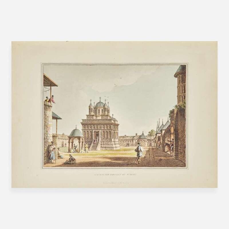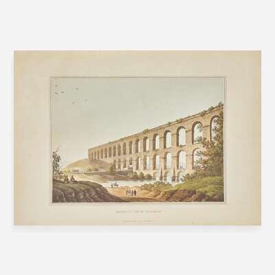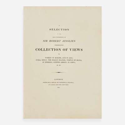 London: Printed for R. Bowyer; by T. Bensley, 1811. Two volumes in one, with: …Collection of Views in Egypt, Asia Minor, &c. &c…, Printed for R. Bowyer; by T. Bensley, 1812. First editions. Folio, 18 1/8 x 13 in. (460 x 330 mm). First volume illustrated with 24 hand-colored aquatint plates (including one folding), on J. Whatman watermarked paper, dated 1809; second volume extra-illustrated with 24 hand-colored aquatint plates as called for, and with an additional eight hand-colored aquatint plates of Palestine, on J. Whatman watermarked paper, dated 1809. Contemporary three-quarter green morocco over patterned cloth-covered boards, stamped in blind and in gilt; edges stained red; marbled endpapers. Atabey 790; see Abbey, Travel 369; Not in Blackmer A lovely first edition R. Bowyer's publications of selections of Luigi Mayer's views and scenes of the Middle East, many of which first appeared in Mayer's earlier Views in Egypt, Palestine and Other Parts of the Ottoman Empire (1804). As Atabey explains, "The plates in these selections are not re-engravings, but plates available from the stock originally printed for Bowyer, with new title pages. These appear to be the earliest selections of Mayer's plates from the Ottoman Dominions." (p. 408). The first volume includes views of Egypt, such as the Great Pyramids of Giza and Cairo, as well as views of Palestine, and Caramania, and the second volume includes magnificent views of Constantinople and the Ottoman Dominions.