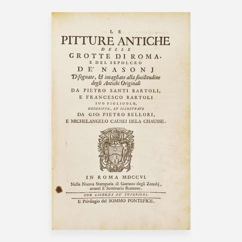 Roma: Gaetano degli Zenobi, 1706. Folio, 14 5/8 x 9 3/8 in. (371 x 238 mm). (viii), (iv), 63 pp. Illustrated with 75 engraved plates by Giovanni Pietro Bellori, and his son, Francesco, and with the woodcut arms of Pope Clement XI on title-page. Contemporary full vellum, spine labels perished, vellum soiled, spine ends and corners worn; speckled red edges; 20th century ownership signature on front paste-down, book-plate of the Royal Society of Literature on same and crossed out in purple pencil and noted “sold”; scattered minor soiling in margins; small loss in corner of pl. XXI, just touching image. A reprint of the 1680 publication by Italian antiquarian and art theorist Giovanni Pietro Bellori and Italian engraver Pietro Santi Bartoli's work on the Roman Tomb of the Nasonii family. Constructed in the second century AD, the tomb was discovered during the expansion of the Via Flaminia in the late 17th century. Over the ensuing years the mausoleum suffered severe damage and looting, and Bartoli's engravings, executed just after it was discovered, serve as the only extant visual record of the tomb before its degradation.