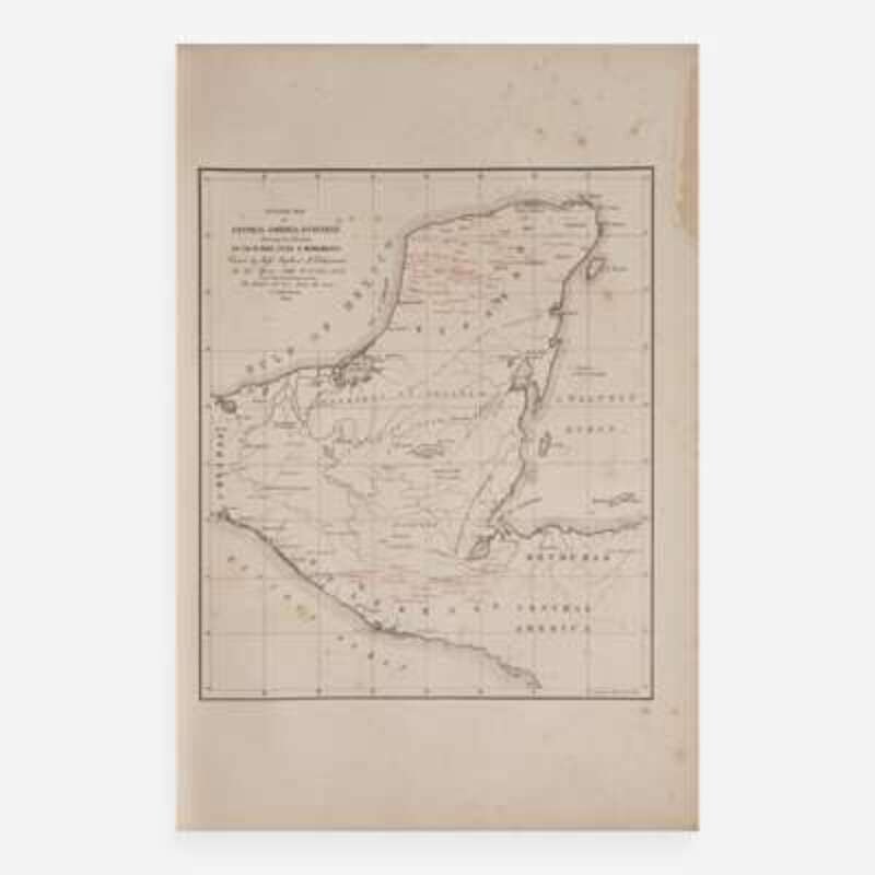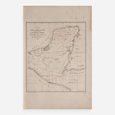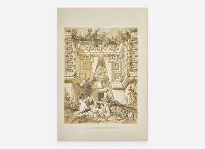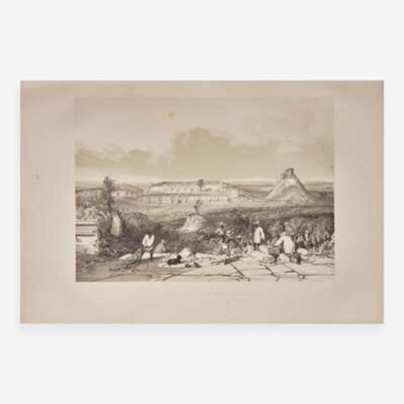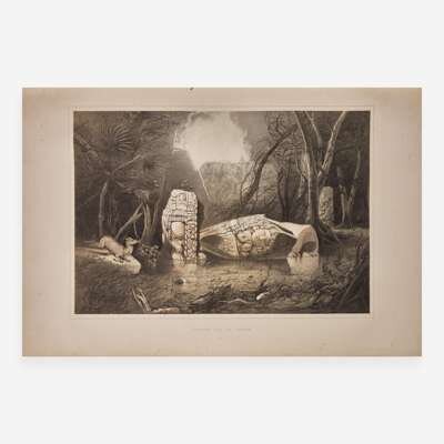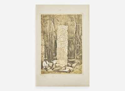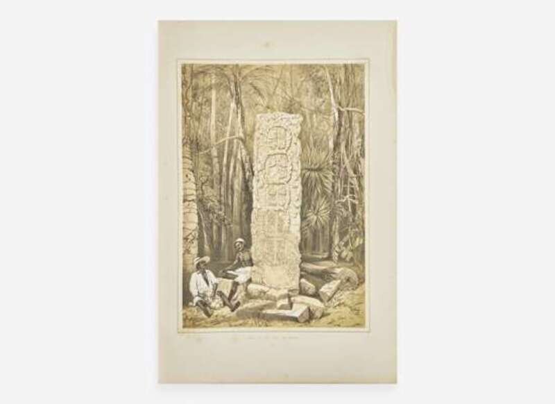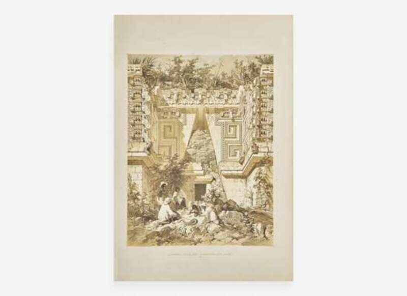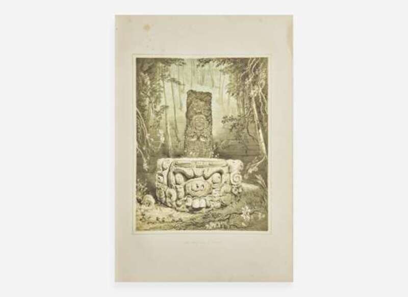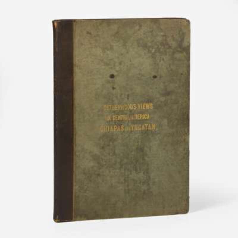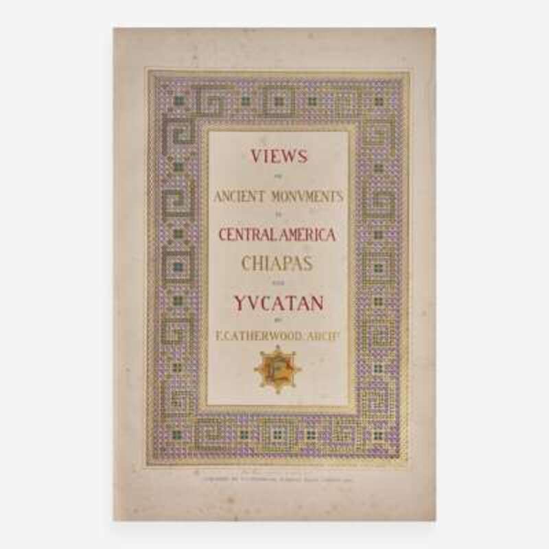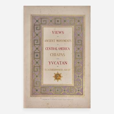 London: Published by F. Catherwood, 1844. First edition (one of only 300 copies printed). Folio, 21 1/8 x 14 1/4 in. (536 x 362 mm). (ii), 24 pp. Letterpress by Vizetelly Brothers and Co. Illustrated with a chromolithographic title-page by Owen Jones, one lithographic map printed in red and in black, and 25 tinted lithographic plates, by Andrew Picken, Henry Warren, William Parrott, John C. Bourne, Thomas Shotter Boys and George Belton Moore, after drawings by Catherwood; each with tissue guard. Original quarter green morocco over green moire silk-covered boards, stamped in blind and in gilt, lettered in gilt on front board, boards and extremities rubbed and worn, joints rubbed, moderate wear to spine ends, corners bumped; all edges trimmed; foxing to title-page, shallow tidemark in upper fore-edge of same; light to moderate foxing to plates as usual; same tidemark in upper fore-edge of map and subsequent three plates; some plates with shallow darkening in edges. Sabin 11520; Tooley 133; Hill, p. 47 Rare and unsophisticated first edition of Frederick Catherwood's stunning plate book on the ancient monuments of Central America. Catherwood, an English draftsman and architect, accompanied archaeologist and explorer John Lloyd Stephens on two expeditions through Guatemala, Belize, Mexico, and Honduras, from 1839-42. Through intense heat, thick jungle, and bouts of malaria, they visited over 40 archaeological sites, including Copán, Palenque and Uxmal, and created systematic surveys of numerous ruins--detailing some locations for the very first time. Following their return to New York, Stephens published two accounts on their expedition that featured dozens of illustrations by Catherwood, Incidents of Travel in Central America, Chiapas, and Yucatan, in 1841--called by Edgar Allan Poe, "the most interesting book of travel ever published"--and Incidents of Travel in Yucatan, in 1843. Both works were incredibly popular, and were for many American and European audiences their first glimpse at ancient Mayan civilization. Stephens and Catherwood aimed to capitalize on the success of both works by publishing a massive catalogue of Mayan archaeology, but due to the projected cost, lack of subscribers, and Stephens’s gradual loss of interest, Catherwood pursued the work alone, albeit on a much smaller scale and at his own expense. He selected some of his finest and most interesting views and had them transferred to lithographic stone by some of the finest lithographers of the day, resulting in the current work. This first edition, printed in only 300 copies, has come to be regarded as one of the finest color plate books of the 19th century. Scarce to auction.
