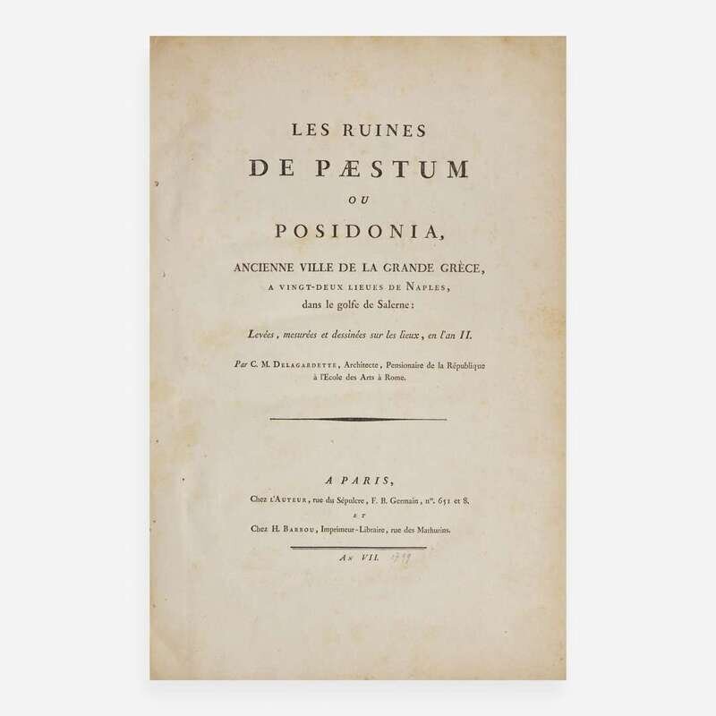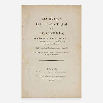 Paris: Chez L'Auteur et Chez H. Barbou, 1799. First edition. Folio, 20 1/2 x 13 1/2 in. (521 x 343 mm). viii, 76 pp. Illustrated with 14 engraved plates (including one folding plate) by Moissy and Gaitte after Delagardette. Contemporary three-quarter brown cloth over marbled paper-covered boards, remnants of paper spine label, expertly rebacked, boards and extremities rubbed; all edges trimmed; light to moderate foxing to plates and text. Blackmer 466 First edition of French architect Claude-Mathieu Delagardette's account of the Greek ruins at Paestum in Southern Italy, containing detailed engravings of the plans, measurements, and elevations of the Temples of Hera and the Temple of Athena. Considered one of the best works on the ruins, its influence can be seen in the subscriber's list that reads like a who's who of prominent late 18th century French architects.