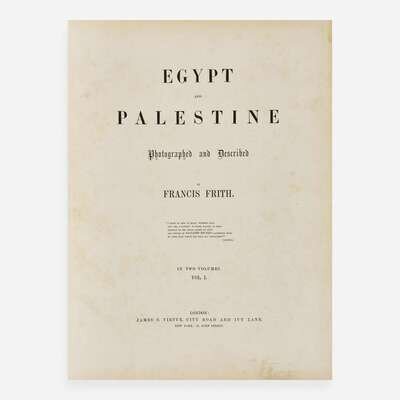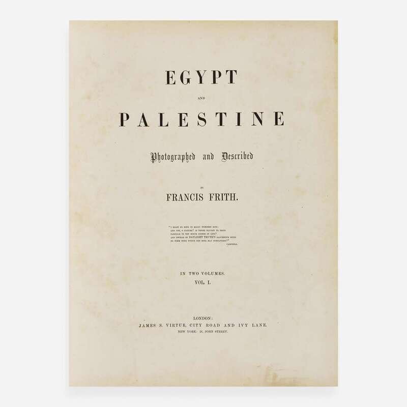 London and New York: James S. Virtue, (1858-59). In two volumes. First edition. Folio, 17 1/4 x 12 5/8 in. (438 x 321 mm). Illustrated with an oval albumen portrait of Frith in Turkish dress and 75 mounted albumen prints, most signed, numbered, and dated in plate by Frith, and with engraved captions on mount; each plate with tissue guard, and with accompanying letterpress text leaves. Original three-quarter brown morocco over brown cloth-covered beveled edge boards, lettered in gilt on front board of each volume, joints and corners expertly restored, boards moderately soiled and rubbed; all edges gilt; foxing to endpapers in each volume; large tidemark in front free endpaper and first free leaf of second volume; foxing to title-pages; small tidemark in bottom of Frith portrait mount; light to moderate foxing and soiling in plate mounts in both volumes; several plates in each volume unevenly faded or discolored; each volume in brown cloth fall-down-back box. Blackmer 1942 First edition of Francis Frith's acclaimed photographs of Egypt and the Holy Land, his earliest and finest work, and considered "one of the most renowned nineteenth-century photobooks." (Martin Parr and Gerry Badger, The Photobook: A History, 2004, Vol. I, p. 28). Frith made three trips to Egypt, Sinai, Ethiopia, and Jerusalem between 1856-60, documenting the region's architecture, antiquities, and culture. Developing his negatives in-situ in the hot and dusty Egyptian desert using an often difficult wet-collodion method, Frith produced these rich and stunning photographs, "which have justly become famous, therefore, as much for their technical as for their artistic achievement, demonstrating photography's astonishing capacity to render the form and texture of the actual." (Parr, p. 28). A handsome copy in original binding.