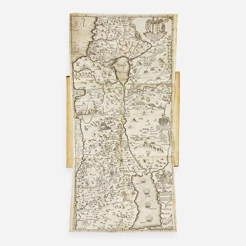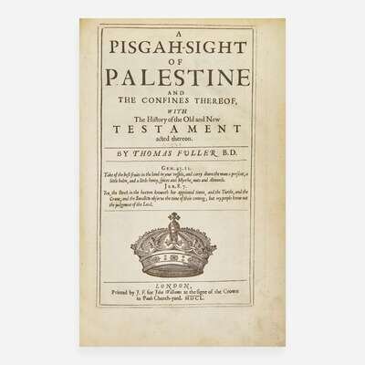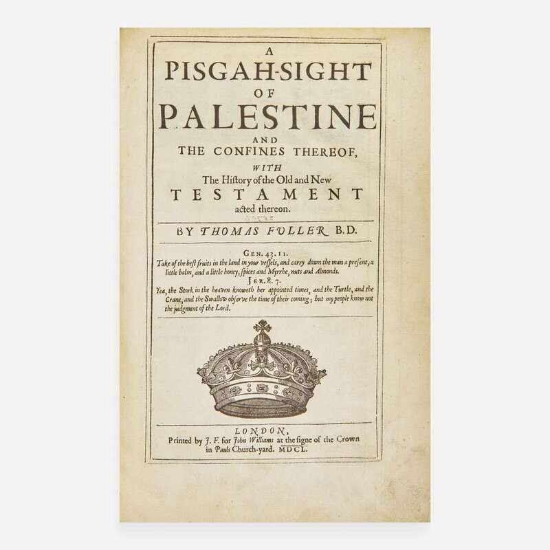 London: Printed for J. F. for John Williams, 1650. First edition. Folio, 13 x 8 1/2 in. (330 x 216 mm). (viii), 434, (1), 202, (18) pp. (with erratic pagination). Text printed within double border with printed side notes. Illustrated with an engraved frontispiece of armorials by John Goddard, engraved title-page, one large engraved folding map of Palestine, 27 engraved double-page plates and maps by Thomas Cross, John Goddard, William Marshall, and Robert Vaughan, as well as numerous wood-engraved head- and tail-pieces, and initials. Modern three-quarter brown calf over marbled paper-covered boards, black leather spine labels, stamped in blind and in gilt; edges stained yellow; matching marbled endpapers; late 19th century inscription at head of front blank; fine early 18th century ownership inscription on verso of frontispiece, "Mrs Dorothea Parsons Her Booke 10th April 1726"; very indiscreet blindstamp of the "Wigan Free Public Library" at bottom corner of frontispiece, engraved title-page, letter-press title-page, large folding map, p. 1, last plate, and final leaf of text; scattered soiling to text; a few leaves with pagination corrected in pencil or ink; scattered minor marginalia in pencil and ink; in brown cloth fall-down-back box. ESTC R18096 A handsome first edition of English historian and preacher Thomas Fuller's classic geographical and historical account of the Holy Land, featuring 20 splendid double-page maps, and one large and highly detailed folding map of the Levant.