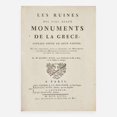 Paris: Chez H.L. Guerin & L.F. Delatour, Jean-Luc Nyon/Amsterdam: Jean Neaulme, 1758. Two parts in one volume. First edition. Folio, 22 1/4 x 16 5/8 in. (565 x 422 mm). xiv, 56, (ii), vi, 28 pp. Illustrated with 60 engraved plates by Le Bas, Littret de Montigny, Neufforge, and Patte after drawings by Le Roy. Full contemporary brown calf, red morocco spine label, stamped in gilt, joints and extremities expertly restored, boards rubbed and scratched, chipping to spine; all edges gilt; marbled endpapers; spotting to title-page and prelims; light to moderate foxing to plates; several plates in second part toned. Blackmer 1009; Atabey 709; Brunet III, 1003 A first edition of this important work that introduced Western Europe to the architecture of classical Athens. For many years this work served as the authoritative text on the subject, and influenced the burgeoning Greek revival style. Le Roy visited Greece in 1754 and succeeded in publishing this first edition four years before the publication of James Stuart and Nicholas Revett's acclaimed The Antiquities of Athens (1762, see lot 151). As Le Roy admits in the preface, technical accuracy was not his sole concern and he included accounts of his travels to enliven the text, hoping to "affect the spectator more vividly" and imbue them with "all the admiration by which one is stricken when looking at the Monuments themselves." An influential text, a second edition appeared in 1770, while an English edition appeared in 1759, and a German edition in 1782.