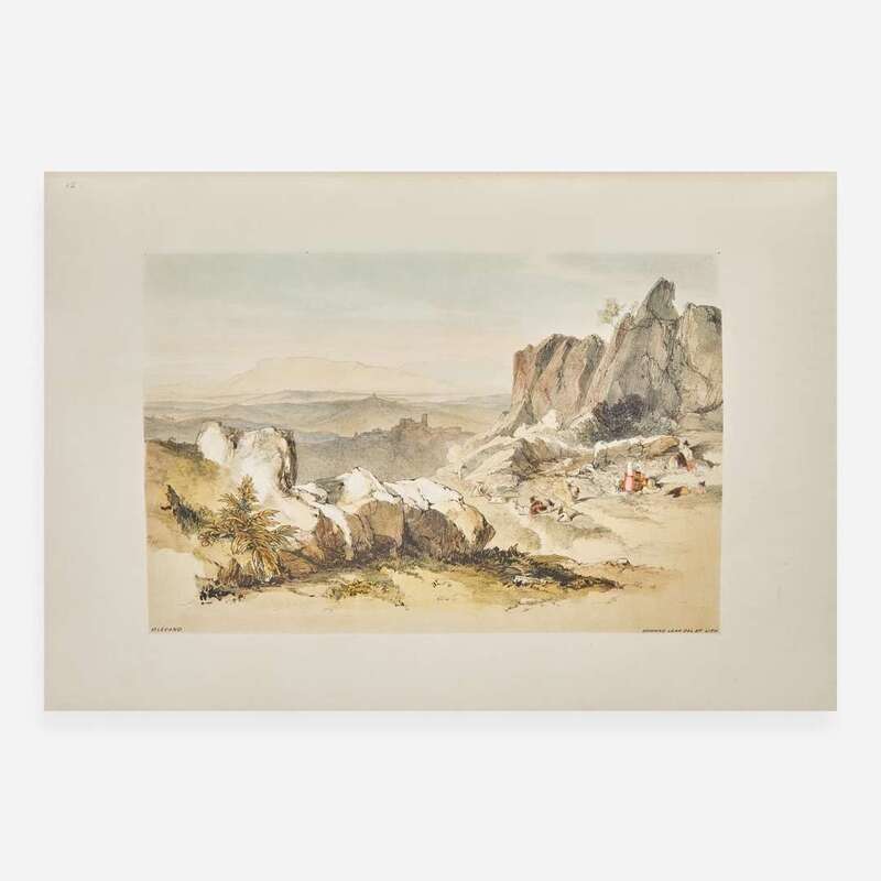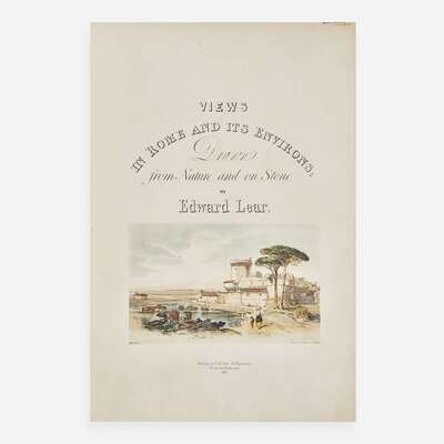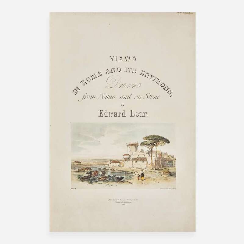 (London): Published by T. M'Lean, Printed by G. Hullmandel, 1841. First edition. Folio, 20 1/2 x 14 1/4 in. (521 x 362 mm). With hand-colored vignette lithographic title-page, lithographed List of Subjects, and 25 hand-colored lithographic plates, by Edward Lear. Modern three-quarter pebbled green leather over purple moire silk-covered boards, stamped in gilt; speckled red edges. Abbey, Travel 183; Ray 91 First edition of Edward Lear's first illustrated travel book. "Beginning in 1837 Lear spent several winters in Italy. Views in Rome records his first impressions of the land that was to become a second home to him. In these panoramic lithographs he is more concerned with the dramatic scenery around Rome than with the Holy City itself. Their freshness and ample size combine to make them his most successful topographical prints..." (Gordon Norton Ray, The Illustrator and the Book in England from 1790 to 1914, p. 59)