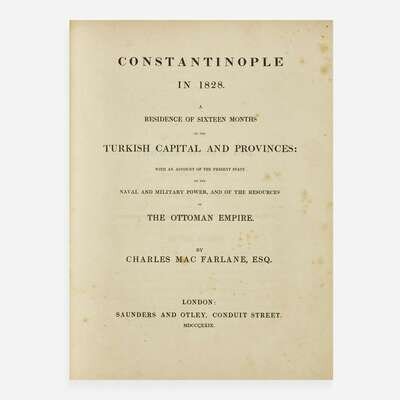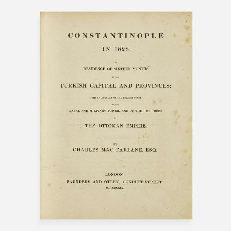 London: Saunders and Otley, 1829. First edition. 4to. xix, (i), 406 pp. Illustrated with a hand-colored lithographic frontispiece portrait of Sultan Mahmood, three lithographic plates (two hand-colored and one printed in sepia), and one double-page lithographic view on india paper. Contemporary three-quarter tan calf over marbled paper-covered boards, stamped in blind and in gilt, red morocco spine label, front board detached, boards and extremities rubbed, rear hinge worn; edges stained red; foxing to prelims, plates, and text. With the armorial book-plate of Victor Albert George Child Villiers, 7th Earl of Jersey, on front paste-down. Abbey, Travel 393; Blackmer 1047 First edition of Scottish writer Charles MacFarlane's first-hand survey of Turkish life and its provinces, containing detailed descriptions of his 16-month travels in Constantinople, Asia Minor, and Smyrna.