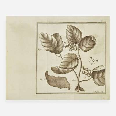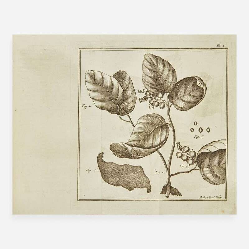 Paris: Chez Gobreau, 1776. First edition. 8vo. (ii), xxxi, (i), 374, (2) pp. Illustrated with 10 engraved folding plates by Moithey Laine. Full speckled tan paper-covered boards, red paper spine label, stamped in gilt, boards and extremities rubbed; red speckled edges; contemporary ownership signature at head of title-page. Sabin 55259 French missionary and naturalist Jean-Barthelemy-Maximilien Nicolson's (1743-73) work on Haiti, covering many aspects of the territory, then known as Saint-Domingue, including flora, fauna, and topics related to ethnography and archaeology. Nicolson served as a Dominican superior in Léogâne from 1769 until his death, and this text was published posthumously by royal command of Louis XV. A scarce work that has been referred to as a valuable supplement to Pierre-François-Xavier de Charlevoix's work Histoire de l'isle Espagnole ou de S. Domingue (1730). This is the first copy we can locate offered at auction since 1984.