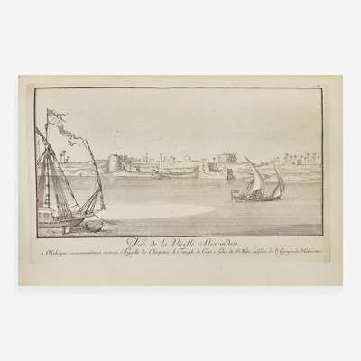 Copenhague: L'Imprimerie de la Maison Royale des Orphelins, 1755. In two volumes. First edition (one of only 200 copies printed). Folio, 17 7/8 x 12 in. (454 x 305 mm). (lx), 104; (vi), 108-288 pp. Illustrated with an engraved allegorical frontispiece, engraved frontispiece portrait of Norden, 159 engraved and numbered plates (including six folding plates and one double-page plate), 15 engraved head- and tail-pieces, and seven engraved historiated initials. Full contemporary mottled and paneled brown calf, brown and black morocco spine labels, boards elaborately stamped in gilt, light wear along extremities, chipping along spines; all edges gilt; marbled endpapers; lengthy inscriptions in Danish on verso of front free endpaper in first volume, ca. early 19th century; caption on Plate LXXXVI cancel, as usual; some expertly repaired closed tears in folding plates; scattered mostly minor spotting to text and plates; each volume in brown cloth fall-down-back box. Brunet IV: 101; Gay 2169; Blackmer 1211 (first English edition) A fine and rare first edition of the earliest systematic description of Egypt and its antiquities by a European. Frederic Louis Norden (1708-42), a Danish naval captain, cartographer, and explorer, traveled through Egypt at the behest of King Kristian VI of Denmark from 1737-38. Accompanied by artist Marcus Tuscher, he made extensive surveys of the country's geography, agriculture, and architecture, and produced the first coherent maps of the country. He was also the first European to penetrate as far as el-Derr in Nubia. This first edition was published by the Royal Danish Academy of Sciences and Letters 13 years following Norden's death from tuberculosis, and features highly detailed engravings of Egyptian ruins, monuments, temples, views, and maps. At the time of its publication it was the most comprehensive description of Egypt available in Europe, and helped spur the scholarly and archaeological interest in ancient Egyptian art and antiquities. A stunning set in contemporary bindings.