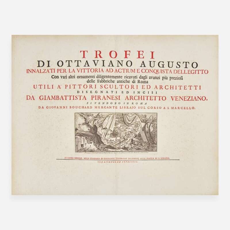 Roma: Giovanni Generoso Salomoni, 1753. First edition. Folio, 20 13/16 x 13 11/16 mm). Double-page title-page printed in red and in black. Illustrated with an engraved vignette on title-page and 10 engraved plates (two folding and three double-page), each with engraved captions below image. Modern three-quarter brown calf over marbled paper-covered boards, red morocco spine label, stamped in blind and in gilt; edges stained green; pale foxing to title-page; light scattered foxing to plates. Focillon J134-143; Hind 34 III Scarce first edition of Piranesi's first major archaeological work and his first treatment of Roman decorative art. "Its principal subject was the two marbled reliefs of military trophies which originally embellished the mostra or head fountain of the Acqua Giulia on the Esquiline and which had been transferred to the Capitol in 1590. Although these were known popularly as the 'Trophies of Marius', Piranesi in his research concluded that they had been erected by Augustus Caesar to commemorate his naval victory at Actium in 31 B.C. In addition to general views of these reliefs, he also included several plates of architectural fragments demonstrating the outstanding decorative invention of the Romans..." (Wilton-Ely, Piranesi, p. 48). Piranesi intended this volume to be "useful to Painters, Sculptors, and Architects," and as a means of "broadening the creative attitudes of his contemporaries." (Wilton-Ely, Piranesi as Architect and Designer, pp. 24-25).