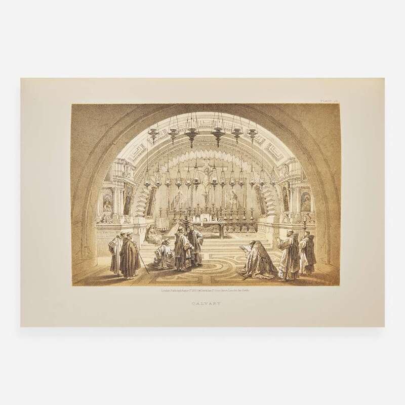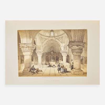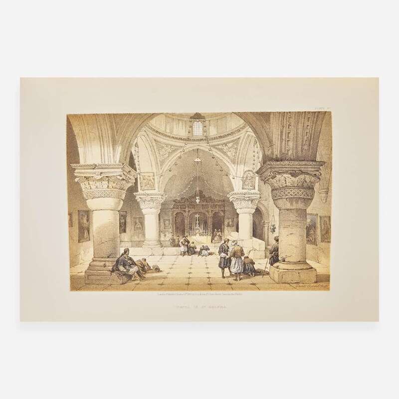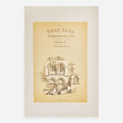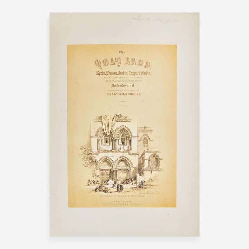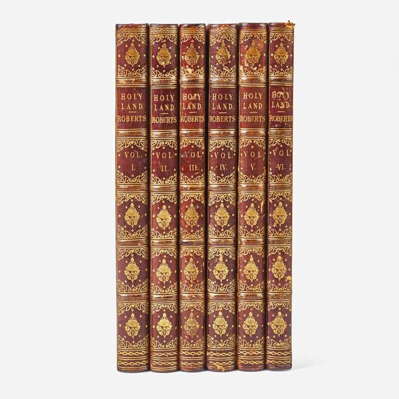 New York: D. Appleton & Co., (1856). In six volumes. First American edition. 4to. Illustrated with 248 numbered and tinted lithographic plates by Louis Haghe after Roberts's drawings (including illustrated title-pages in each volume and frontispieces in Vols. I, III, IV, V, and VI), and two maps; each with original tissue guard. Contemporary three-quarter brown morocco over purple cloth-covered boards, stamped in gilt, boards and extremities rubbed, joints rubbed with scattered wear; all edges gilt; marbled endpapers; contemporary ownership signature in pencil on verso of front free endpapers and at head of each title-page. A superb copy of the rare first American edition of Roberts's monumental work on the Holy Land. Roberts was the first British artist to sketch the monuments of Ancient Egypt, traveling some 800 miles south of Cairo in a short two-month span in 1838. He produced more than one hundred sketches while on his travels which were then exquisitely printed in lithography by Louis Haghe. This is only the second copy of the American edition we can locate in the auction record since 1972.