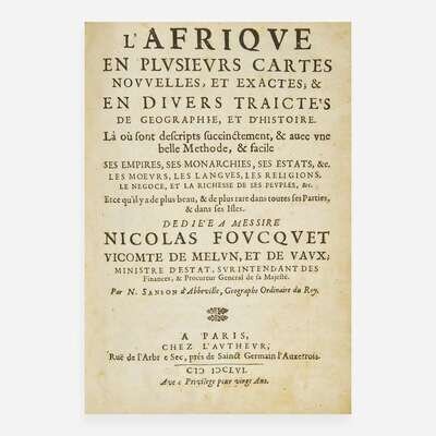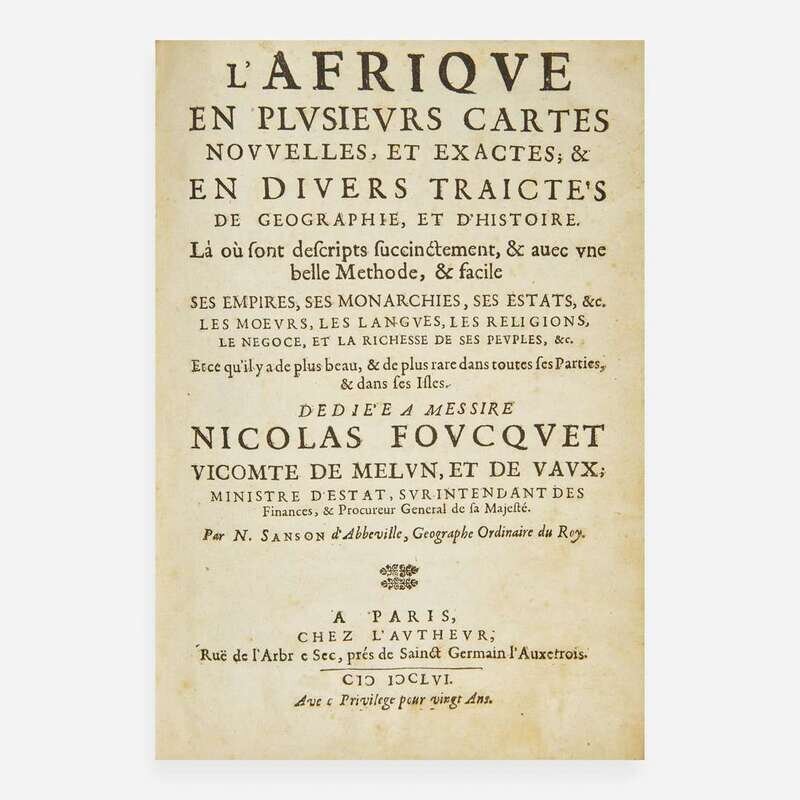 Paris: Chez L'Autheur, 1656. First edition. 4to. Unpaginated. Illustrated with 18 engraved double-page maps, each with hand-colored outlining. Contemporary brown mottled calf, rebacked with portions of original spine laid down, boards and extremities rubbed; all edges trimmed; foxing to prelims and scattered in text; scattered toning to text; interleaved with blanks sheets, with manuscript on leaf following fourth map. From the library of British collector Humphrey Winterton, and with his book-plate on front paste-down; in full brown niger solander box; by G.M. A handsome first edition of Nicholas Sanson d'Abbeville's atlas of Africa. Considered one of the best atlases of the continent published in the 17th century, and containing 18 maps of Africa’s various regions. This work was the third book in Sanson's series of four atlases of the continents of the world, the others being on America, Europe, and Asia, and published between 1648-57.