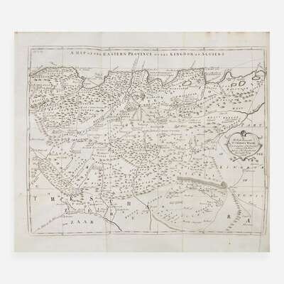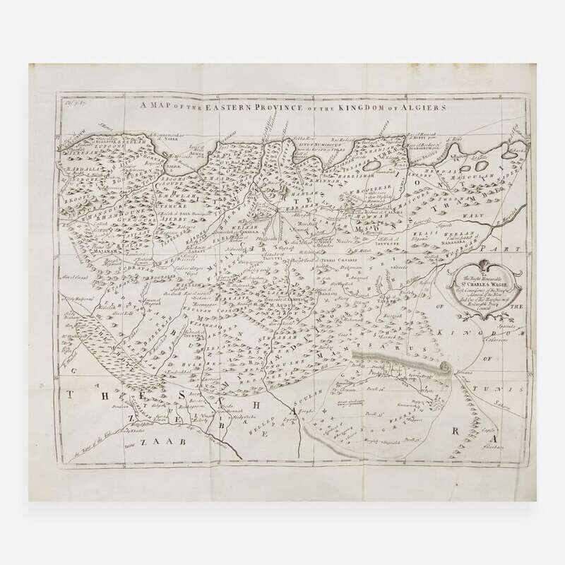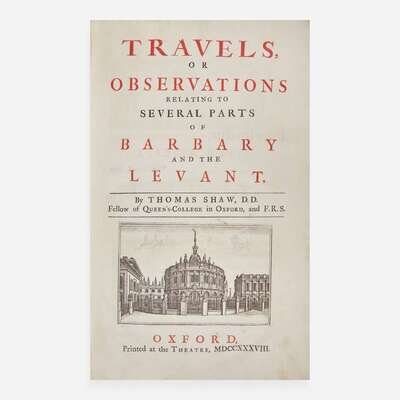 Oxford: Printed at the Theatre, 1738. First edition. Folio, 13 3/8 x 8 5/8 in. (340 x 219 mm). (viii), xv, (i), 442, (2), 60, (8) pp.; with half-title. Title-page printed in red and in black and with an engraved vignette. Illustrated with 32 engraved plates on 29 sheets (including 12 maps), as well as numerous engraved head- and tail-pieces, historiated initials, one engraved sheet of music, and numerous in-text engravings, woodcuts, and diagrams. Contemporary full paneled brown calf, stamped in blind, rebacked, tan morocco spine label, stamped in gilt, boards lightly scratched and rubbed, wear along extremities, corners worn; red speckled edges; foxing to endpapers; light foxing to prelims; scattered mostly minor spotting to text; bottom part of map of Southern Province of the Kingdom of Algiers restored in facsimile; scattered wear along folds to some folding plates. Armorial book-plate of Samuel Peploe, L.L.D. on front paste-down, additional armorial book-plate of Sir Joseph Verdin, 1st Baronet, on front free endpaper. ESTC T1146090 First edition of English cleric Thomas Shaw's travels across North Africa and the Middle East. A major feat of travel literature, praised for its accurate descriptions of the region as well as for the book's design and illustration. Upon taking Holy Orders, Shaw was appointed to the factory of English merchants at Algiers, from where during the 1720s he traveled extensively throughout Egypt, Sinai, Cyprus, Palestine, and Syria. While on his travels he gathered copious amounts of information regarding the region's natural history and antiquities, which formed the basis of the present work.