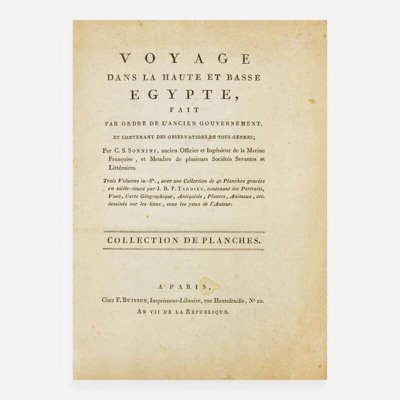 Paris: Chez F. Buisson, (1799). In four volumes. First edition. Three 8vo text volumes and one 4to atlas. Atlas volume illustrated with an engraved portrait of Sonnini, 38 engraved plates, and one large folding map of Egypt, by Tardieu. Text volumes bound in contemporary mottled tan calf, red and green morocco spine labels, stamped in gilt, lightly worn; all edges trimmed; blue paste paper endpapers. Atlas volume bound in quarter brown calf, stamped in gilt, over marbled paper-covered boards, extremities and boards lightly rubbed; all edges trimmed; patterned endpapers; light to moderate foxing to plates. Blackmer 1572; Gay 2250 A handsome set of this travelogue and study of the natural history of Egypt by French naturalist Charles-Nicolas-Sigisbert Sonnini de Manoncourt. A valuable early resource on the flora, fauna, and animal life of the region, as well as Egyptian antiquities. Sonnini set out with Baron Francois de Tott in 1777 on an expedition to Egypt, and upon their arrival in Alexandria, Sonnini received orders from Louis XVI to explore the region, where he then proceeded to travel through Turkey, Greece, and Crete, returning to France in 1780.