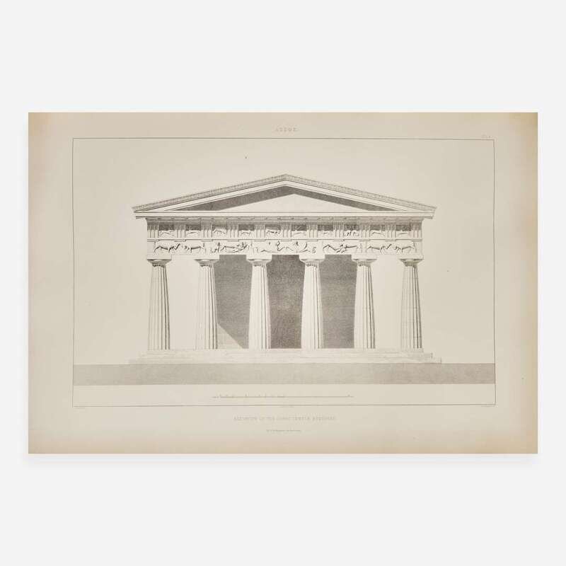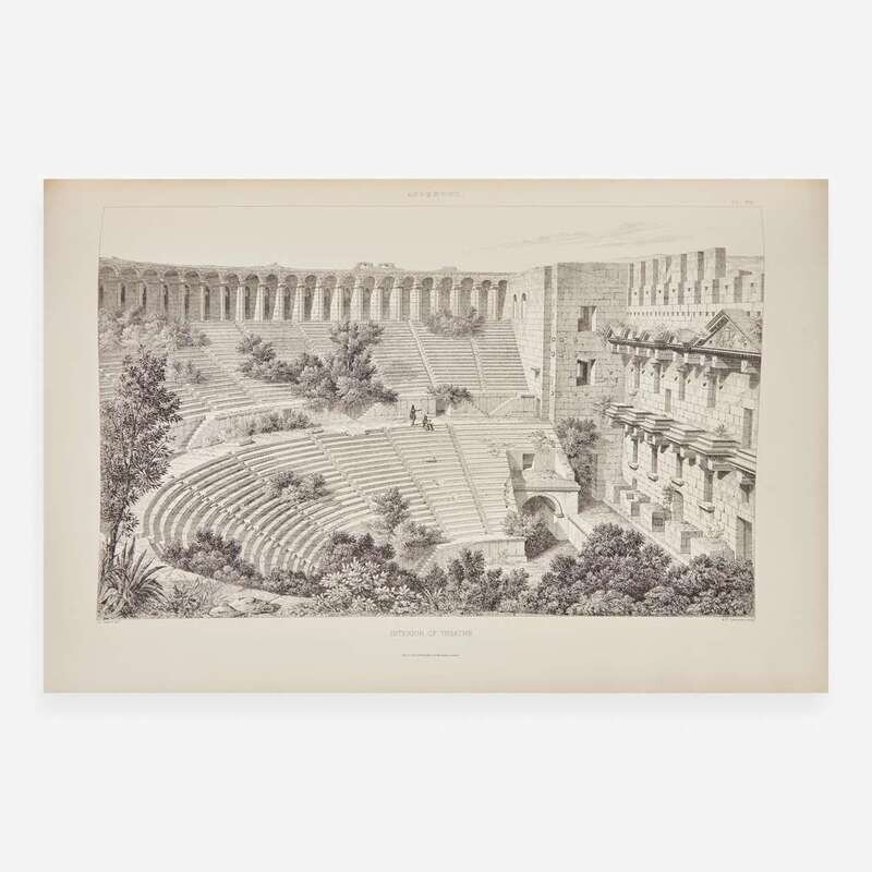 A handsome first edition of French archaeologist and historian Charles Texier's study on Byzantine architecture in Asia Minor, drawn from studies made by him in the region between 1833-37, and from Richard Popplewell Pullan's studies executed on behalf of the Society of the Dilettanti in 1862. The work includes detailed maps, plans, elevations, and reconstructions of ruins of temples and theaters at Assos, Branchidae, Aizani, Ancyra, Aphrodisias, Aspendus, Iassos, Myra, Patara and Pergamus, and is a sequel to Texier and Pullan's Byzantine Architecture, published the previous year, in 1864 (see lot 152).