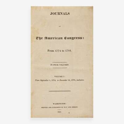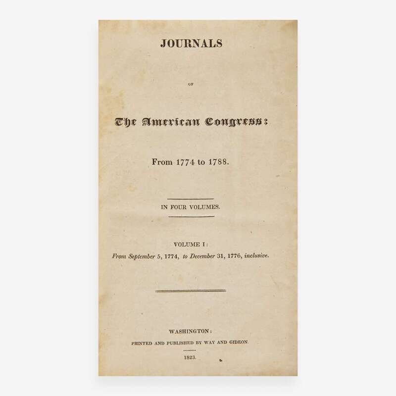 Four-volume set of the Journals of Congress, covering the First Continental Congress to the final session before the institution of the Federal Constitution, privately printed with Congressional approval in 1823. The Declaration of Independence is printed on pp. 394-396 in the first volume. Published during the period of renewed interest and reflection on the history of the United States in the lead up to the 50th anniversary of the Declaration, this set unfortunately failed to sell, and after unsuccessfully lobbying the Senate for financial assistance, the House of Representatives, in February 1825, resolved to purchase 300 copies for their members’ use.