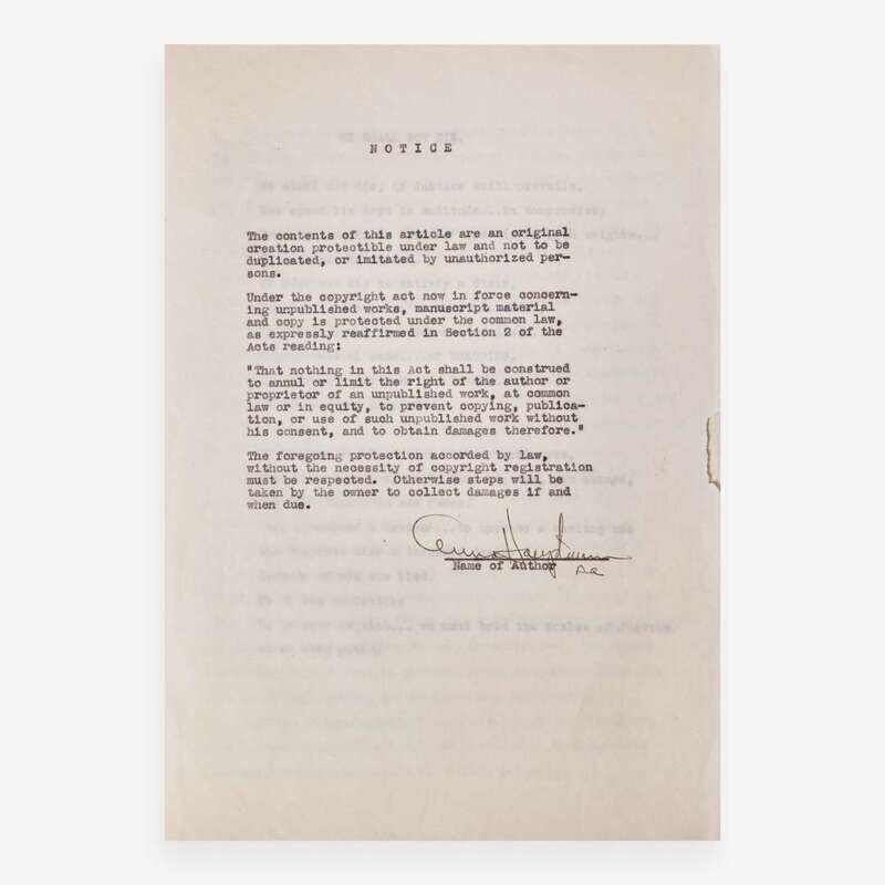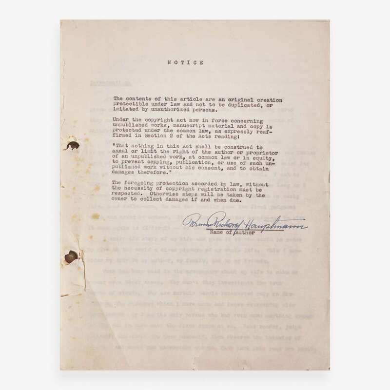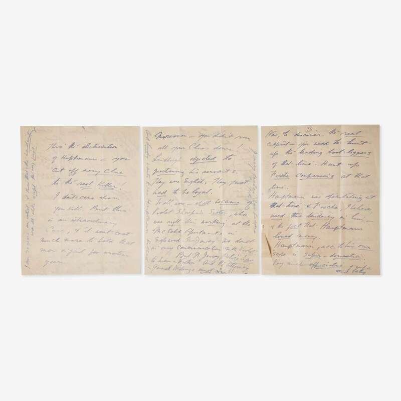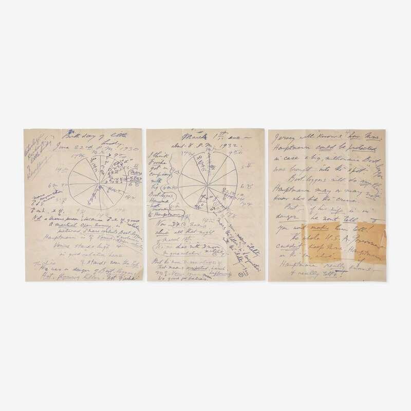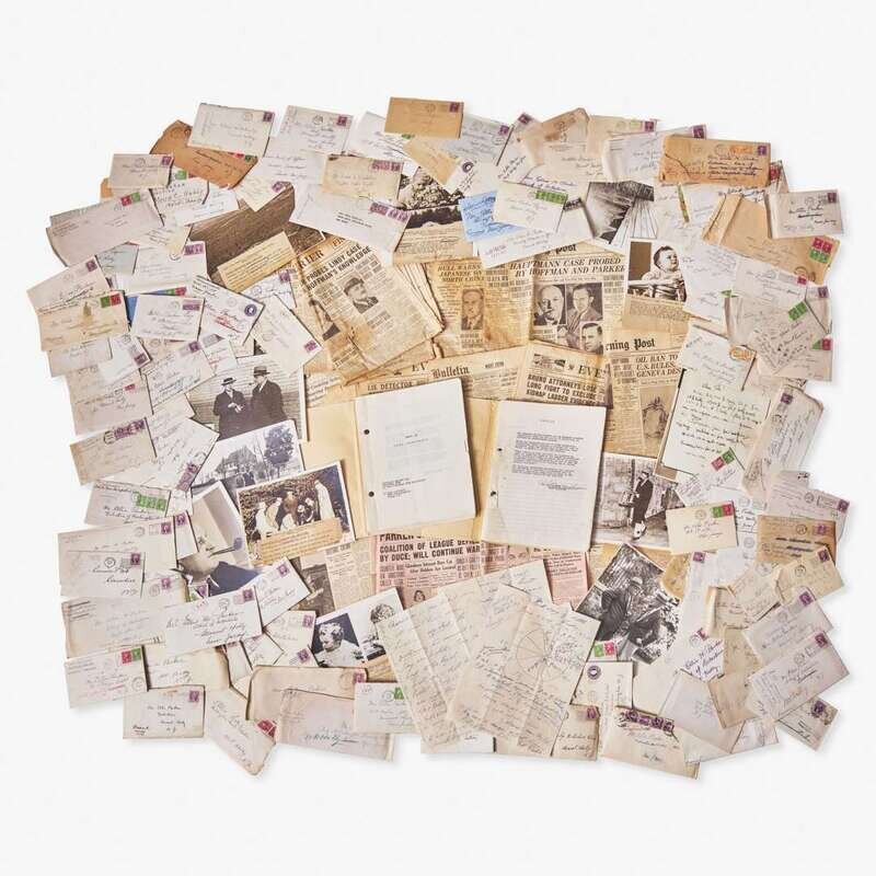 Archive of over 1,100 items from New Jersey detective Ellis H. Parker related to his four-year investigation into the 1932 kidnapping and murder of Charles A. Lindbergh, Jr., the infant son of American aviator Charles Lindbergh. The archive includes six pages of Parker's handwritten notes concerning potential suspects, made in the midst of his investigation; approximately 986 handwritten and typed letters sent to Parker with ideas, leads, or suggestions of persons of interest in the case from a concerned public, most with carbon copies of Parker's replies; 53 contemporary photographs, including press photographs of the Lindbergh crime scene, as well as of various pieces of important evidence; 43 typed letters between Parker and Frank Pease, author of the first book to question the guilt of the convicted killer, Bruno Hauptmann, The Hole in the Hauptmann Case (1936); Parker's copy of the ten-volume official transcript of Hauptmann's 1935 death penalty appeal trial (The State of New Jersey vs. Bruno Richard Hauptmann, 1936); 30 contemporary newspaper issues or clippings about the kidnapping, or Parker himself; and more. Condition and locations vary. Condition report available upon request. Of particular note, the archive also includes contemporary typescripts of the autobiographies of Bruno Richard Hauptmann, The Story of My Life (222 pp.), written during his time on death row, as well as the autobiography of his wife Anna, The Story of Anna Hauptmann (121 pp.), both signed by their respective authors. We have only been able to locate one other contemporary copy of either Hauptmann autobiography, both at The New Jersey State Police Museum in Trenton, New Jersey. Their copy of Anna Hauptmann's story is only 44 pp. Ellis H. Parker (1871-1940) became Burlington County Chief of Detectives in 1891 at only 20 years old, and is often regarded as one of the first profilers of criminal behavior. At the time he was considered "America's Sherlock Holmes", likely due to his uncanny skills of deductive reasoning. Over his near-fifty year career he investigated hundreds of cases, becoming an inspiration for the archetypal American detective during the Golden Age of Detective Fiction in the 1920s and 30s. Fletcher Pratt described Parker in his, The Cunning Mulatto and Other Cases of Ellis Parker (1935), as "probably the best detective in America...his total record is thus somewhat ahead of that established by Scotland Yard..." Similarly, John Reisinger, in his Master Detective: The Life and Crimes of Ellis Parker, America's Sherlock Holmes (2006), said Parker "...would solve over ninety-eight percent of the murders in his New Jersey County...", and had "...a worldwide reputation for solving cases that baffled everyone else." On the evening of March 1, 1932, Charles Augustus Lindbergh, Jr. was abducted from his crib in his home in East Amwell, New Jersey. Much like the rest of the country, Parker avidly followed the developments in the case, but he was never formally involved in the investigation as the crime was committed outside of his county. Due to his friendship with New Jersey Governor Harold G. Hoffman, shortly after the kidnapping took place, Parker was personally recruited by the governor to lead his own unofficial investigation. He operated with total independence by pursuing his own leads, identifying his own persons of interest, questioning suspects, and sharing little to no information with state or federal officials. Due to his national reputation and frequent criticism of the official investigation, Parker received many letters regarding the case, hundreds of which are included here. They created a seemingly endless supply of tips and potential suspects. Some were promising, such as an undated letter from fellow detective Fred Shanbecker: "I enclose...a photograph of Ludwig Schmidt as well as a Post Office flier of his fingerprints...Mr. Schmidt seems quite able to adjust himself to any crime...no one seems to know just what his activities were between Oct. 10, 1931 and June 11, 1932...(an inspector) told me I was not the first to question the possibility of Schmidt's participation in the Lindbergh matter." Others were more mundane, such as a December 20, 1935 letter from a woman claiming that "Several weeks before the discovery of the Lindbergh baby's body, I was told by a bar-tender in an Orange Tavern that he overheard the plotting of the baby's kidnapping." Finally, some were purely fanatical, such as one July 22, 1934 letter: "Dear Sir, I am writing you a dream I had the 3rd night after the Lindbergh Boy was kidnapped...this dream may seem foolish but you may get something out of it..." Ellis Parker eventually came to suspect Paul Wendel, a former New Jersey lawyer with ties to organized crime, who had acted as an informant for Parker in the past. Parker became convinced that Wendel knew something about the kidnapping, as many at that time believed the New York City Mafia was somehow involved. Included in the archive is a copy of the article "Lindbergh Erred In Dealing With Gang, Parker Asserts" from the May 14, 1932 issue of the Philadelphia Public Ledger, quoting Parker as saying "In the first place, the Lindberghs never should have paid any ransom whatever, or had any dealings with the underworld...When we've got to the point where we've got to stoop to deal with these gangsters, then the whole police force ought to resign..." Two months after the abduction, on May 12, 1932, the baby's body was discovered near the Lindbergh estate, and President Franklin D. Roosevelt announced that the FBI would take over the case. By early 1936, Bruno Richard Hauptmann (1899-1936), a German immigrant and carpenter, was on death row after being convicted for the murder. Two years earlier, in September 1934, he was arrested after being caught in possession of a number of marked bills that were given to the kidnappers as ransom for the baby. Parker disagreed with the court's ruling as well as the evid