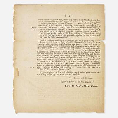 (Philadelphia), 1779. Bifolium sheet, 10 1/4 x 8 1/2 in. (260 x 216 mm). 4 pp. Printed document, being an Epistle from the National Half-Year Meeting held in Dublin and communicated to the Meeting for Sufferings held in Philadelphia on April 15, 1779; signed in type by Clerk John Gough. Creasing from old folds; horizontal crease in bottom of both leaves; small chipping along edges; open tear in gutter of upper fold; light scattered foxing. Bristol B4879; Shipton & Mooney 43631; ESTC W8641 (locating only four institutions with copies); Not in Sabin, Hildeburn, or Smith A rare four-page Quaker document denouncing increased materialism among its members, and addressing “the declined state of many in our Society from the Life and Power of pure Religion.” The letter condemns the behavior and pursuit of riches and material goods amongst Friends, stating that "an evil emulation hath gotten in, not provoking one another to love and good works, but vying with each other in the grandeur of their houses, the order and provision of their tables, the richness of their furniture, and the gaiety of their own dress, and that of their children, contrary to the self-denial, the humility and meekness prescribed by the gospel of Christ, in which they profess to believe..." Published during a period of "danger, uncertainty, and distrust," especially for persecuted American Quakers during the Revolutionary War, the letter urges "that friends may let their moderation in all things appear, that those who have launched out extensively in trade, with as little delay as possible, set about contracting their engagements therein into a moderate compass, and instead of risquing the reputation of Truth, the peace of their own minds, and the welfare of their immortal souls, in grasping at things beyond their reach, in order to provide for superfluous expence, reduce their wants and expences within the limits and bounds of Truth, and then a little trade with frugality and industry will be found sufficient." We have located only one other copy in the auction record, in 1918.