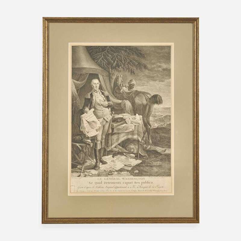 Paris: Chez le Mire, 1780. Engraved full-length portrait of George Washington, by Noel Le Mire after the paintings by Jean-Baptiste Le Paon and Charles Willson Peale. Trimmed to plate mark and mounted to heavy paper. Print: 18 3/4 x 12 7/8 in. (476 x 327 mm); sheet: 22 x 16 5/16 in. (559 x 414 mm). In mat and in frame, 26 3/16 x 20 in. (665 x 508 mm). Hart 31c; Baker 21; Wick, pp.29-30 A scarce and early full-length engraved portrait of General George Washington, engraved by Frenchman Noel Le Mire after a painting by Jean-Baptiste Le Paon (the face and figure of Washington were further based on Charles Willson Peale's 1776 portrait of Washington). The elaborate scene shows Washington in military uniform outside of his headquarters, holding important documents such as the Declaration of Independence, and the Treaty of Alliance between the United States and France, and overlooking a receding landscape with marching Continental Army soldiers. In the foreground can been seen numerous torn documents and bills relating to British Parliament and King George III, while in the background Washington's enslaved valet Willaim "Billy" Lee is depicted attending to the General's horse. Le Mire subsequently produced a companion piece to this portrait depicting the Marquis de Lafayette. Provenance