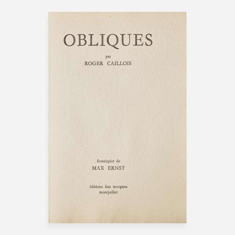 Montpellier: Editions Fata Morgana, (1967). First and limited deluxe edition, one of only 18 copies on Verge d'Auvergne, reserved for the author and publisher (this copy reserved for Alain Clément, and stamped on colophon "Exemplaire de Alain Clément"), signed by Caillois (from a total edition of 629 copies). 8vo. 68, (8) pp. Illustrated with an etched frontispiece by Max Ernst, signed and numbered by him at bottom ("H.C. 2/18"). Original stiff wrappers, printed in black and in blue; gatherings loose as issued; in blue cloth chemise. Alain Clément was a French publisher who collaborated with Caillois, and others, on the philosophical review Espace. Roger Caillois was a writer and sociologist born in Rheims in 1913. He studied at the Lycee Louis le Grand, the Ecole Normale Superieure, and the Ecole Pratique de Hautes Etudes, and taught at Lycee de Beauvais. In 1938 he founded, with Georges Bataille, Pierre Klossowski, and Michel Leiris, the College de sociologie, and during the 1930s contributed to Bataille's literary and philosophical journal Acephale. Following World War II he worked for UNESCO, and in 1952 he founded the interdisciplinary journal Diogenes. He also edited La Croix du Sud, a collection of French translations of contemporary Latin American authors, and published works on ludology. He was elected to the Academie Francaise in 1971, and died in 1978. A fine and unique copy.