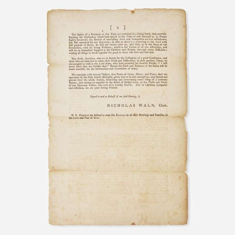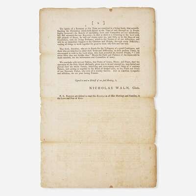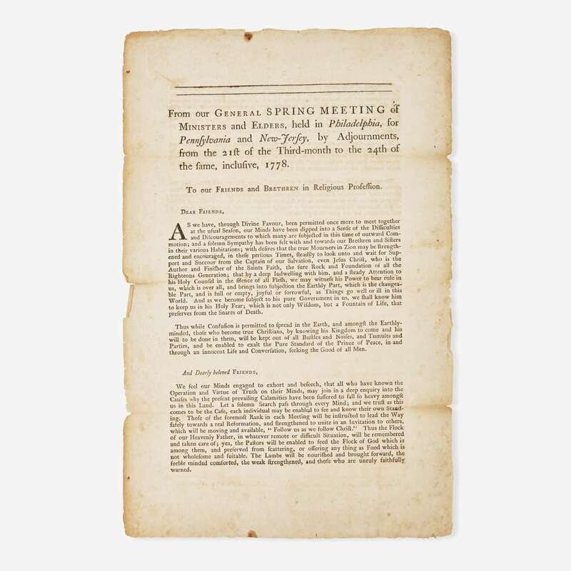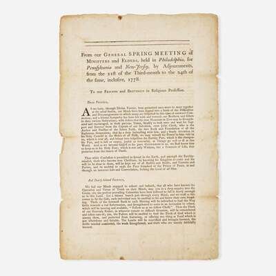 From our General Spring Meeting of Ministers and Elders, held in Philadelphia, for Pennsylvania and New-Jersey...from the 21st of the Third-month to the 24...(Philadelphia), 1778. One sheet, 13 3/8 x 8 1/2 in. (340 x 216 mm). 2 pp. Printed document, being a Quaker Epistle from the General Spring Meeting of Ministers and Elders, held in Philadelphia; signed in type by Clerk Nicholas Waln. Creasing from contemporary folds; scattered wear and short closed tears along edges; light foxing. Sabin 61683; Evans 15801; Hildeburn, Pennsylvania 3706; ESTC W33435 (locating only six institutions with copies); Not in Smith