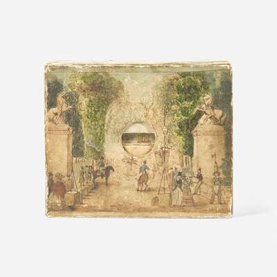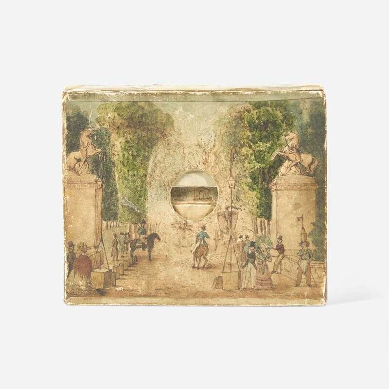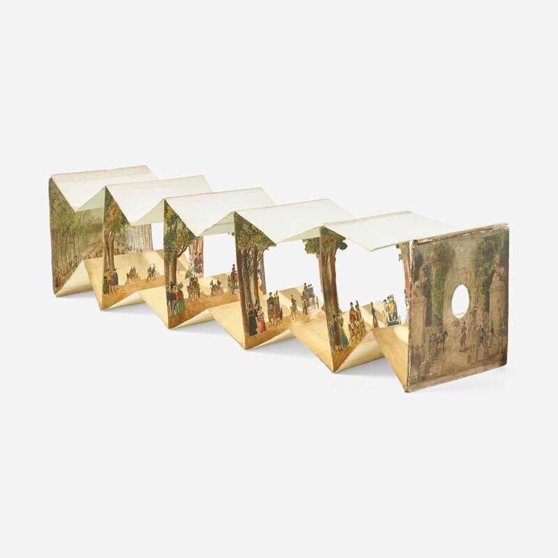 No place, no date, (presumably France, ca. 1828). Hand-made accordion-style paper peepshow after "Optique No. 4. Promenade de Longchamp" (Paris, ca. 1827), depicting the tree-lined Champs-Élysées thronged with strolling pedestrians, figures on horses, and horse-drawn carriages. Comprising four pen and watercolor cut-out scenes, and one pen and watercolor back-scene, connected at top and bottom by paper bellows (watermarked 1828); in hand-made paper viewing boards, with pen and watercolor illustration; first paper bellow at top separated; boards worn and rubbed. See Hyde, Paper Peepshows 24 A charming and unique contemporary hand-made example of this 1827 French paper peepshow, depicting the popular annual society promenade down the Champs-Élysées in Paris. The view looks east down the tree-lined boulevard toward the then incomplete Arc de Triomphe (completed in 1836), busy with strolling figures and horse-drawn carriages. The promenade traces its origins to the early days of the reign of Louis XV, beginning as a pilgrimage made to the Abbey of Longchamp during Holy Week. The Abbey was torn down during the Revolution, and in the following years the pilgrimage was transformed into a fashionable promenade, especially for Paris's milliners, dressmakers, and tailors, where they advertised their goods to the strolling passersby. A similar hand-made example is held in the Jacqueline and Jonathan Gestetner Collection at the Victoria & Albert Museum (see Hyde 25). Provenance