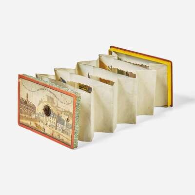 (Germany, ca. 1830s). Accordion-style peepshow depicting Edinburgh Castle from the Grassmarket; comprising five engraved cut-out scenes with hand-coloring, and one hand-colored engraved back-scene; connected by paper bellows, left and right; in original illustrated paper-covered pasteboard viewing case with three peepholes; original paper sleeve presumably wanting. Approximately 18 in. (457 mm) in length when opened; in later wooden box. Scattered wear and soiling to box, but overall very well-preserved. Hyde, Paper Peepshows, 106; OCLC 315308438 A charming and scarce accordion-style peepshow of Edinburgh, Scotland's Old Town, depicting Edinburgh Castle from the Grassmarket in the large central view with parading troops, figures, and carriages in foreground, and flanked by two smaller views, at left the interior of Trinity College Kirk, and at right, a scene of a ball in progress with dancers. We have located only three examples, at Yale University Library, the National Library of Scotland, and a variant double-sided example at the Victoria & Albert Museum (see Hyde 104-106). Provenance