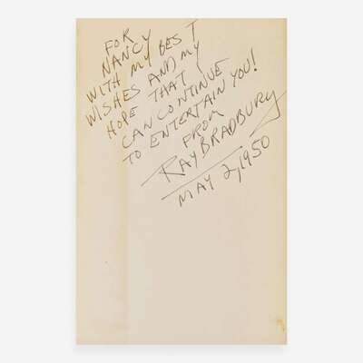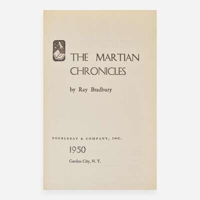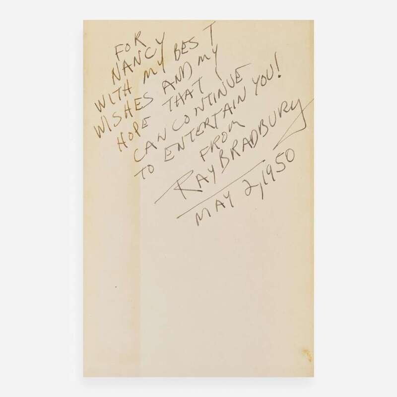 Garden City: Doubleday & Company, Inc., 1950. First edition. 8vo. 222 pp. Presentation copy, inscribed by Bradbury for Nancy Brash on front free endpaper, two days before publication, "For Nancy with my best wishes and my hope that I can continue to entertain you! From Ray Bradbury May 2, 1950". Publisher's pale green cloth, stamped in maroon, spine and boards unevenly toned; all edges trimmed; old residue on rear paste-down; in original price-clipped dust-jacket, chipping and wear along edges, spine panel darkened. Currey, p. 56 A scarce presentation copy of Ray Bradbury's second book and first novel, inscribed by him on May 2, 1950, two days before the book's publication. Provenance