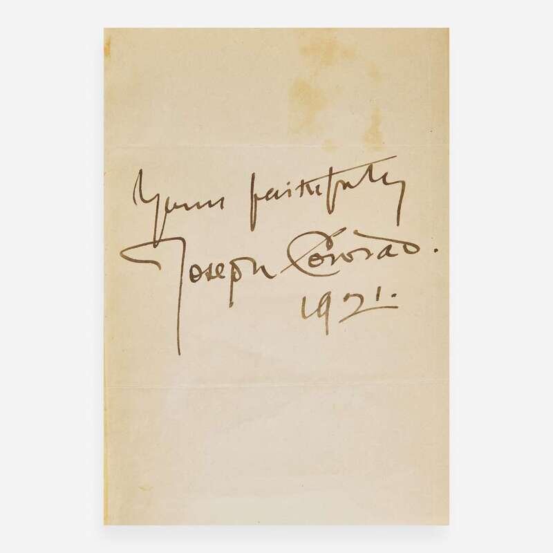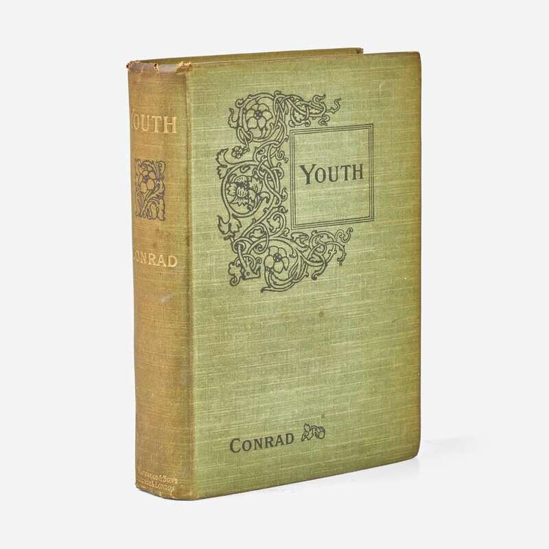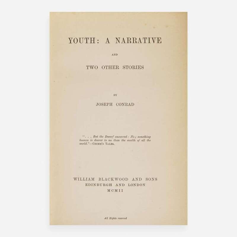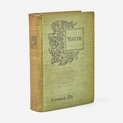 Edinburgh and London: William Blackwood and Sons, 1902. First edition. 8vo. (vi), 375, (1), 32 pp. (ads, dated 10/02). Inscribed and dated by Conrad on tipped-in sheet at front, "Yours faithfully Joseph Conrad 1921." Publisher's green cloth, stamped in black and in gilt, spine and extremities darkened, boards lightly faded; scattered soiling to boards, spine ends lightly frayed; all edges gilt; book-plate of Samuel Heiman on front paste-down; scattered minor spotting to text. A handsome first edition of Conrad's most important collection of stories, featuring the first book-form appearance of his masterpiece, "Heart of Darkness." Also featuring the stories "Youth" and "The End of the Tether," all three having previously appeared in Blackwood's Edinburgh Magazine. Provenance