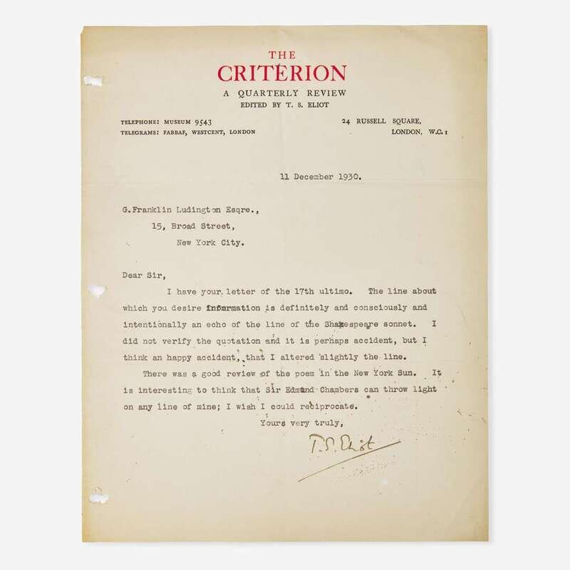 London, December 11, 1930. Single sheet, 10 1/2 x 8 1/4 in. (268 x 210 mm). Typed letter on The Criterion stationery, signed by T.S. Eliot, to New York lawyer, G(eorge). Franklin Ludington: "Dear Sir, / I have your letter of the 17th ultimo. The line about / which you desire information is definitely and consciously and / intentionally an echo of the line of the Shakespeare sonnet. I / did not verify the quotation and it is perhaps accident, but I / think an happy accident, that I altered slightly the line. / There was a good review of the poem in the New York Sun. It / is interesting to think that Sir Edmund Chambers can throw light / on any line of mine; I wish I could reciprocate. / Yours very truly, / T.S. Eliot." Creasing from contemporary folds; three holes along left edge, small hole below Eliot's signature. Printed on pp. 428-429 in The Letters of T.S. Eliot Volume 5: 1930-1931 (Yale University Press, 2015) American poet T.S. Eliot writes to an admirer from New York, Franklin Ludington, who had inquired about the source of a line in his poem Ash Wednesday (1930). Ludington had noted that the fourth line in the poem, "Desiring this man's gift and that man's scope," had been cited by English literary critic and Shakespearean scholar Sir Edmund K. Chambers in his recent study of Shakespeare, William Shakespeare: A Study of Facts and Problems. Ludington wrote to Eliot asking if "whether your line is an echo of a Shakespearean source, which I have not been able to discover, or whether it is illuminating but not illuminated by the Shakespearean connotation which Professor Chambers gives to it." (p. 428, The Letters of T.S. Eliot Volume 5: 1930-1931). Eliot responds here in the affirmative, that the line "is definitely and consciously and intentionally an echo of the line of the Shakespeare sonnet." The line quoted by Eliot from Shakespeare was "Desiring this man's art and that man's scope" from Shakespeare's Sonnet 29. The review mentioned here by Eliot was "Eliot the Poet" by P.M. Jack, printed in the November 15, 1930 edition of the New York Sun. Provenance